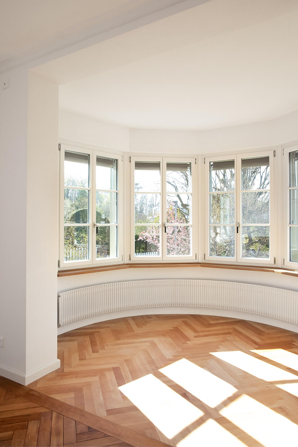 Das hundertjährige, freistehende Einfamilienhaus wurde vor ca. 40 Jahren bereits einmal umfassend renoviert. Bei diesem Eingriff ist ein Grossteil der originalen Bausubstanz verloren gegangen. Wieder freigelegt und aufgefrischt werden konnten einzig Teile der alten Fischgrat-Parkettböden aus Buchenholz. Der Grundriss im Erdgeschoss wurde zu Gunsten einer offenen Raumgestaltung neu organisiert. Auch das Dachgeschoss, welches früher kleinteilige Mansarden und Estrichräume enthielt, wurde ausgebaut und mit einer grosszügigen neuen Lukarne ergänzt. Nur im 1. Obergeschoss blieb die alte, kammerartige Raumaufteilung erhalten, dort befinden sich die Kinderzimmer. Auf den drei Wohngeschossen wurden die Nasszellen neugestaltet und im EG die Küche zu den Wohnräumen hin geöffnet. Ein direkter Zugang aus dem Wohnzimmer zum Garten wurde neu erstellt. Alle Oberflächen im Haus wurden erneuert: die Wände und Decken neu verputzt und die Bodenbeläge aufgefrischt oder ersetzt. Dank der Dämmung des Dachs und der Kellerdecke, dem Ersatz der Fenster sowie des Einbaus einer Erdsonden-Wärmepumpe konnte das Haus auch energetisch optimiert werden. Die Auffrischung der Fassade sowie die Neugestaltung der Umgebung komplettierten die umfassende Sanierung.