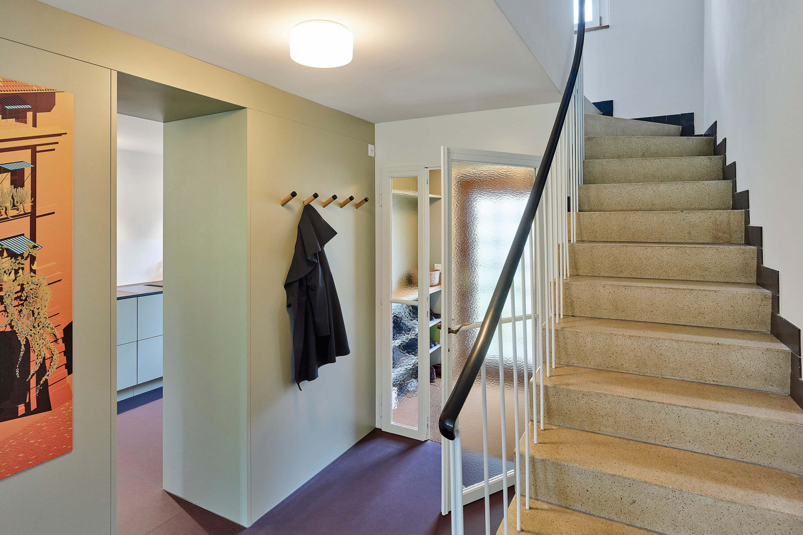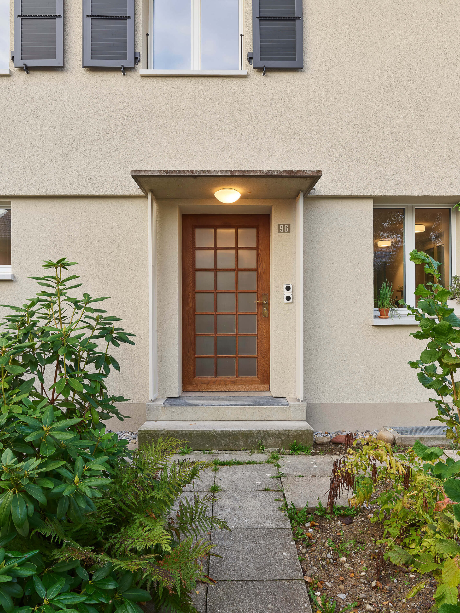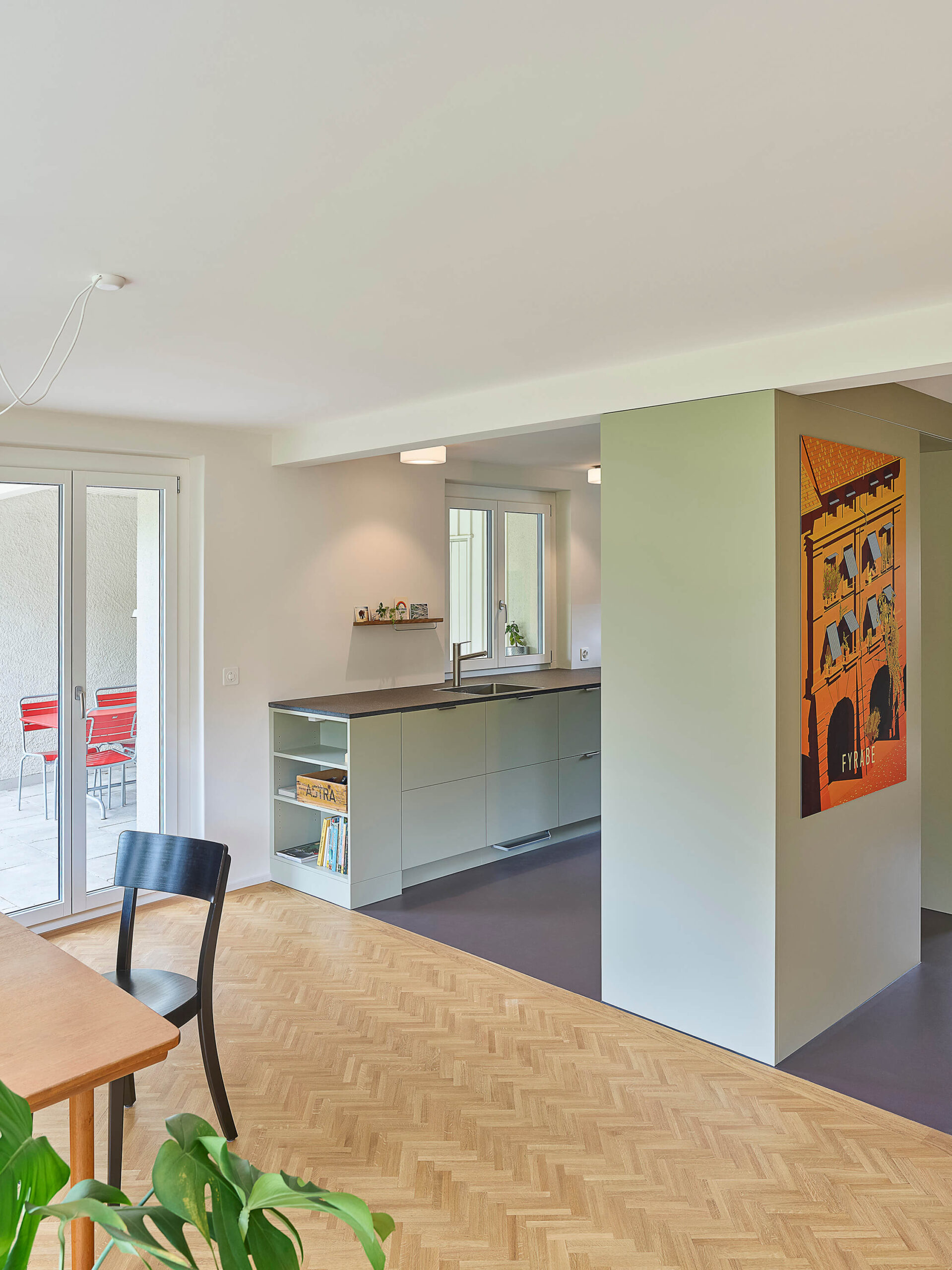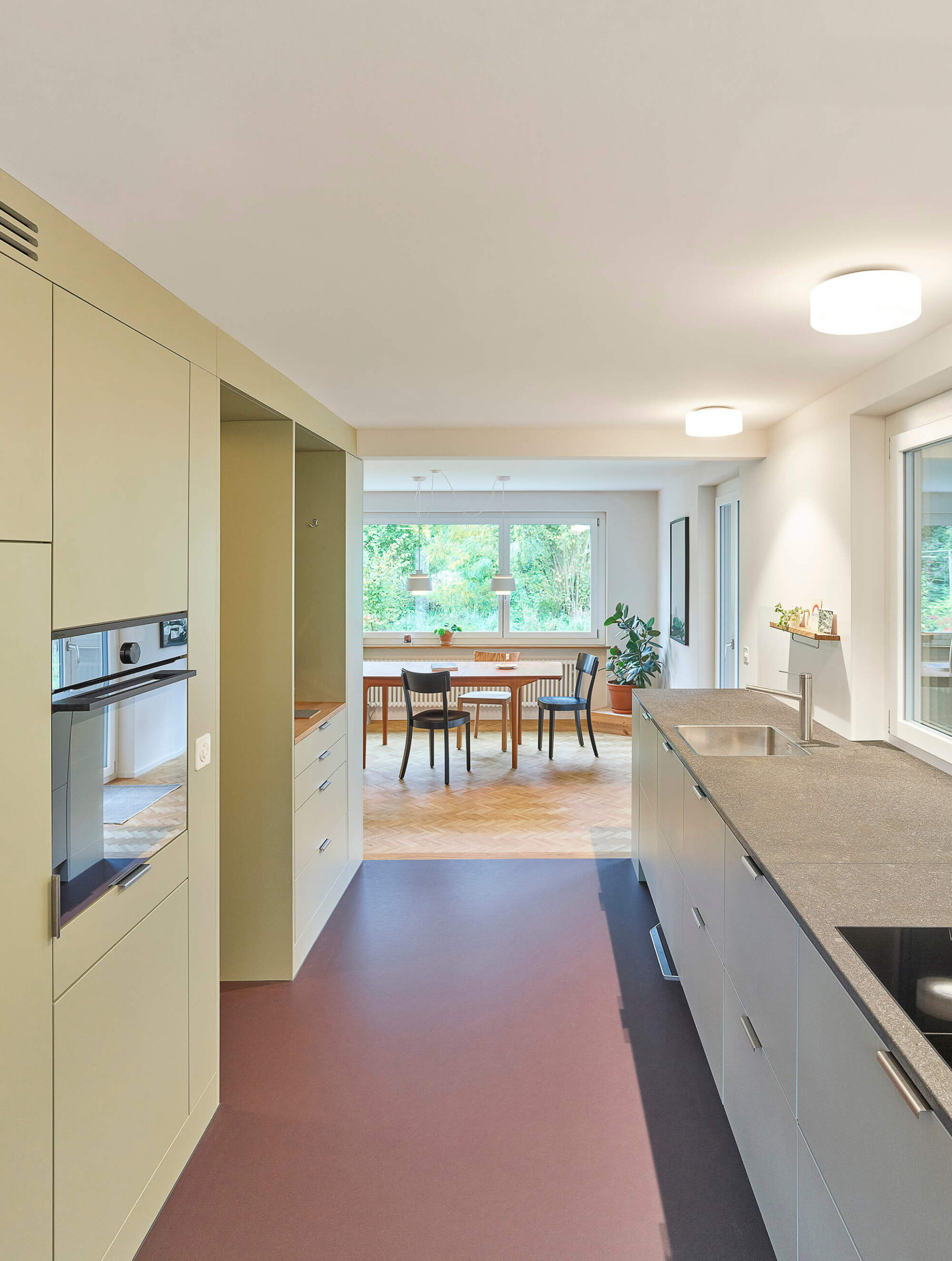 Im Zuge der umfangreichen Sanierung mit den energetisch notwendigen Eingriffen, stand die Anpassung der bestehenden Raumstruktur an die heutigen Bedürfnisse im Vordergrund. So entstanden im Erdgeschoss durch die neue Anordnung der Küche und mittels grosszügigen Wanddurchbrüchen neue Raumverbindungen und erweiterte Sichtbezüge in den grossen Garten. Der neu direkt neben der Küche liegende gedeckte Aussenraum wurde durch die Demontage der bestehenden Glasfront wieder geöffnet. Im Innenraum schaffen die neuen Bodenbeläge neue Raumzonen, die Oberflächenbeschaffenheit wurde entsprechend der Nutzung der Räume eingesetzt: Teppich aus Kokosfaser im Eingangsbereich, Linoleum in der Küche und Fischgratparkett im Wohn- und Essbereich. Im Obergeschoss ist das vergrösserte Bad nun über eine Ankleide mit dem Schlafzimmer verbunden. Sämtliche Wände wurden neu verputzt und in Abstimmung aller Oberflächen farblich hervorgehoben. Als energetische Massnahmen sind eine neue Fassadendämmung, neue Fenster und der Ersatz der Ölheizung durch eine Wärmepumpe (Erdsonde) ausgeführt worden.