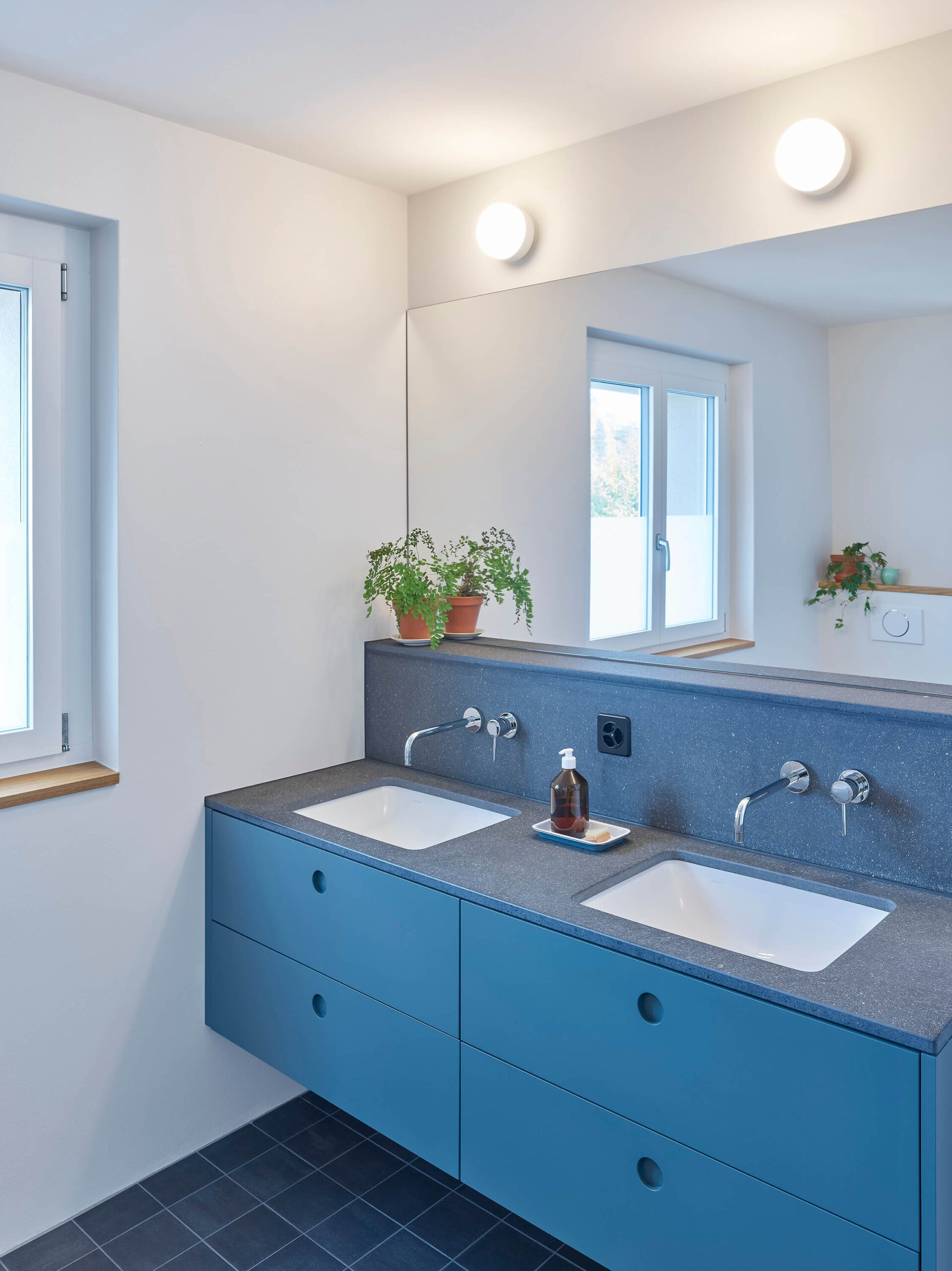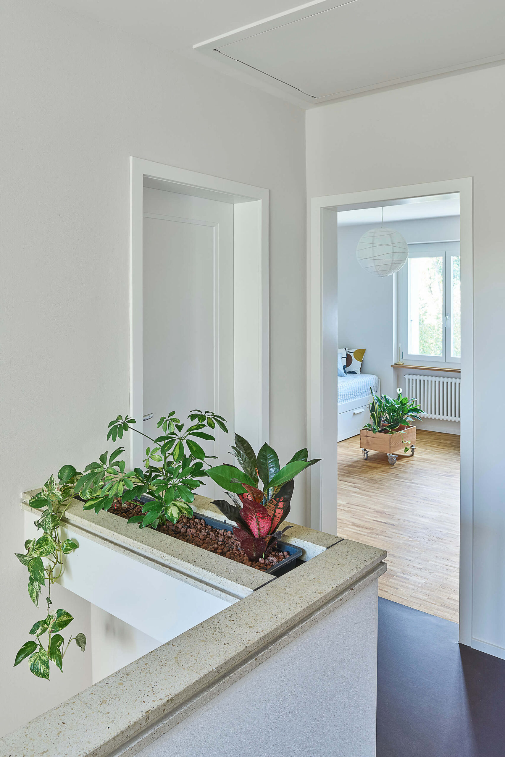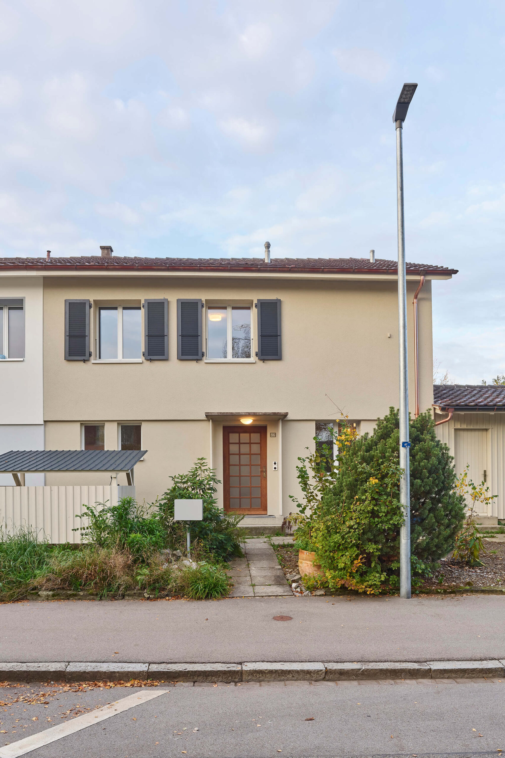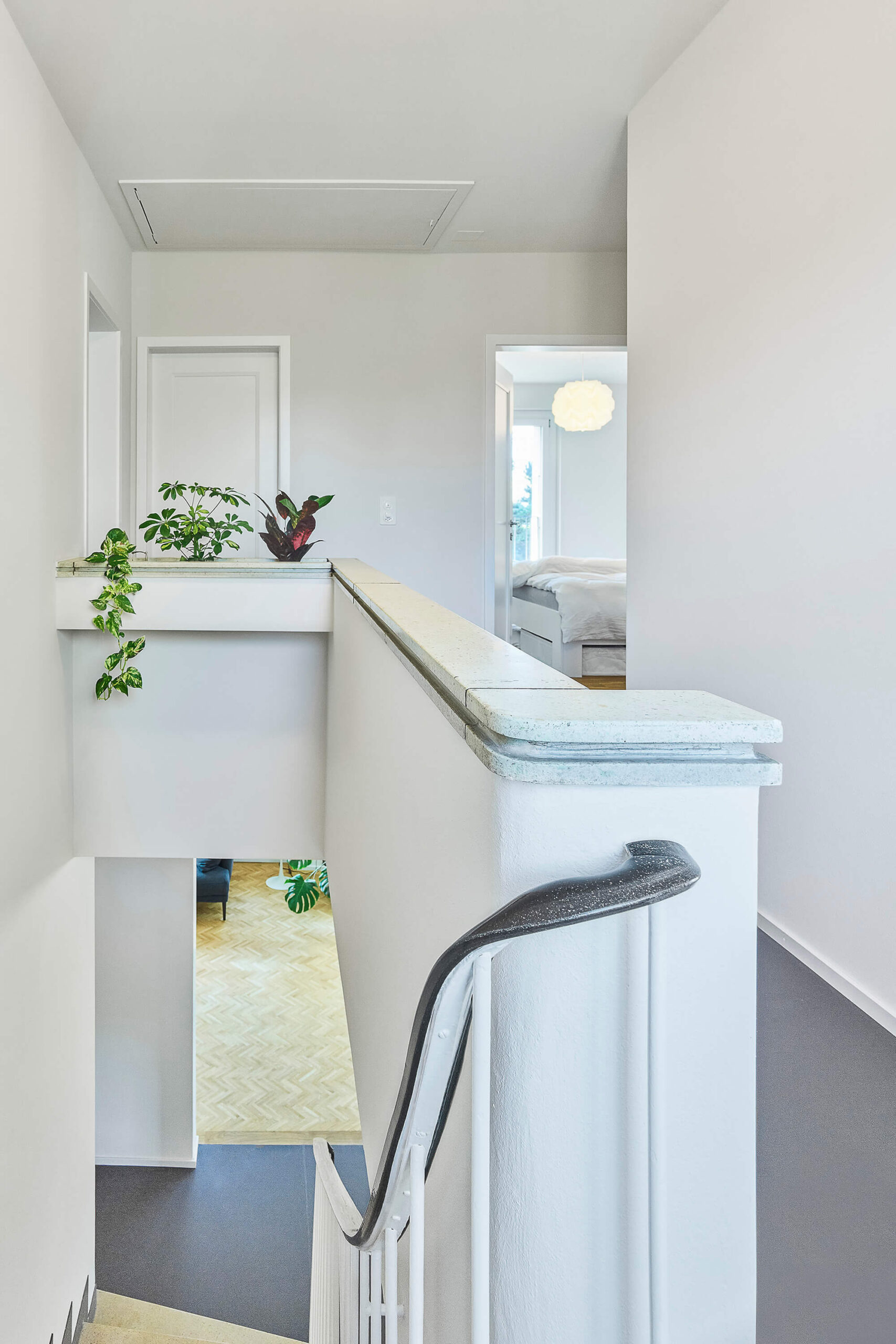Im Zuge der umfangreichen Sanierung mit den energetisch notwendigen Eingriffen, stand die Anpassung der bestehenden Raumstruktur an die heutigen Bedürfnisse im Vordergrund. So entstanden im Erdgeschoss durch die neue Anordnung der Küche und mittels grosszügigen Wanddurchbrüchen neue Raumverbindungen und erweiterte Sichtbezüge in den grossen Garten. Der neu direkt neben der Küche liegende gedeckte Aussenraum wurde durch die Demontage der bestehenden Glasfront wieder geöffnet. Im Innenraum schaffen die neuen Bodenbeläge neue Raumzonen, die Oberflächenbeschaffenheit wurde entsprechend der Nutzung der Räume eingesetzt: Teppich aus Kokosfaser im Eingangsbereich, Linoleum in der Küche und Fischgratparkett im Wohn- und Essbereich. Im Obergeschoss ist das vergrösserte Bad nun über eine Ankleide mit dem Schlafzimmer verbunden. Sämtliche Wände wurden neu verputzt und in Abstimmung aller Oberflächen farblich hervorgehoben. Als energetische Massnahmen sind eine neue Fassadendämmung, neue Fenster und der Ersatz der Ölheizung durch eine Wärmepumpe (Erdsonde) ausgeführt worden.