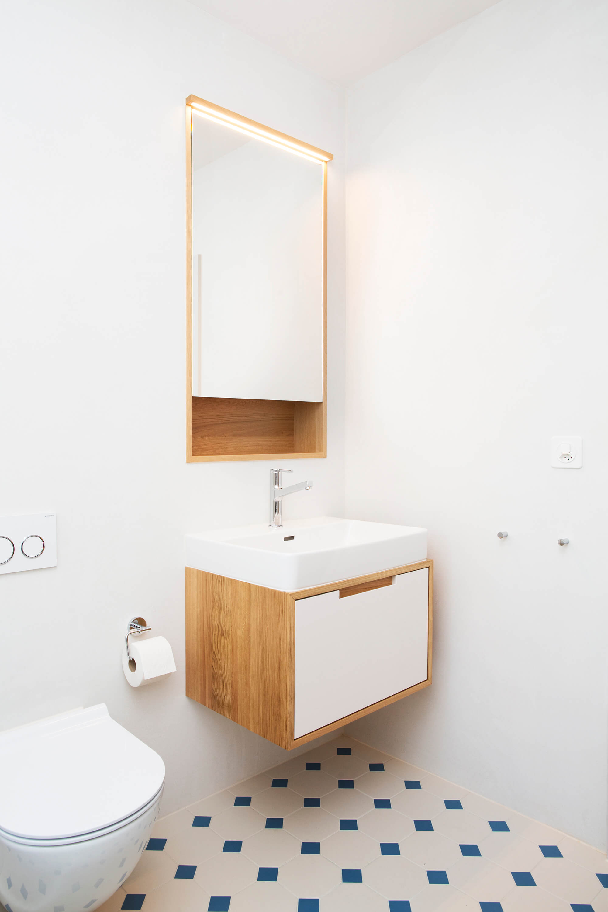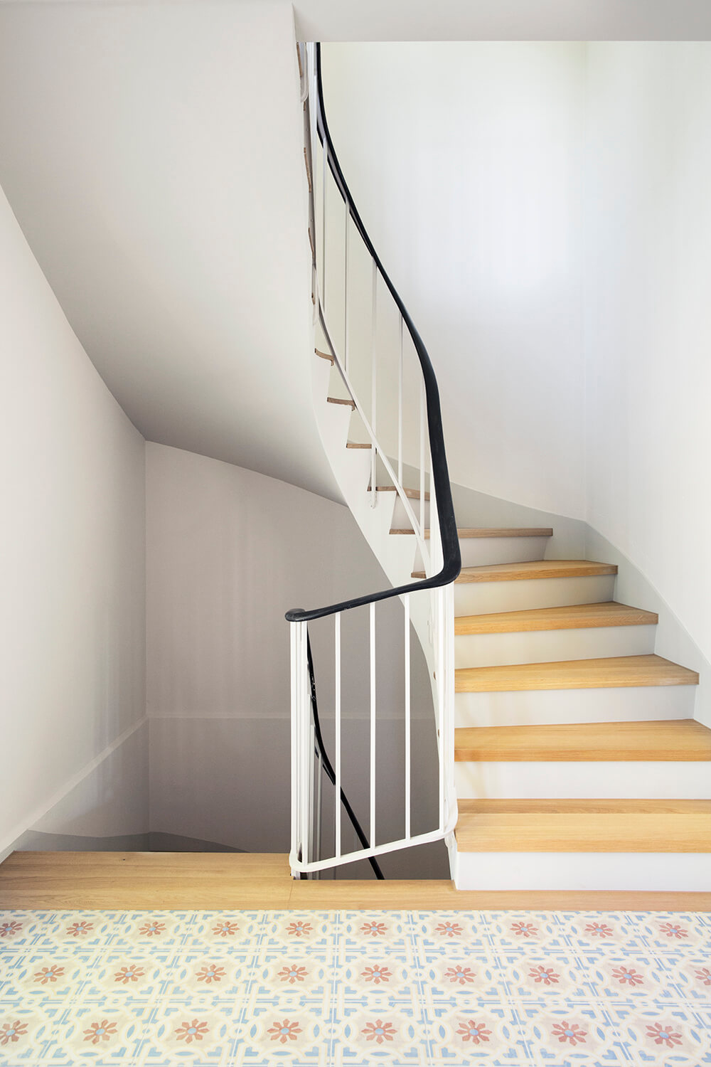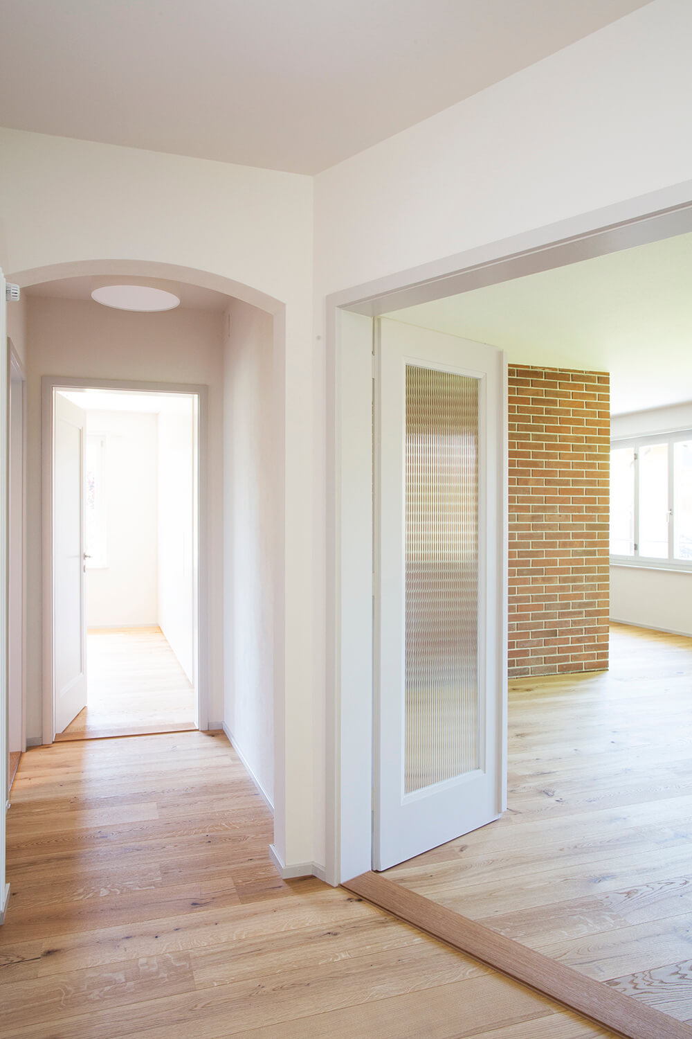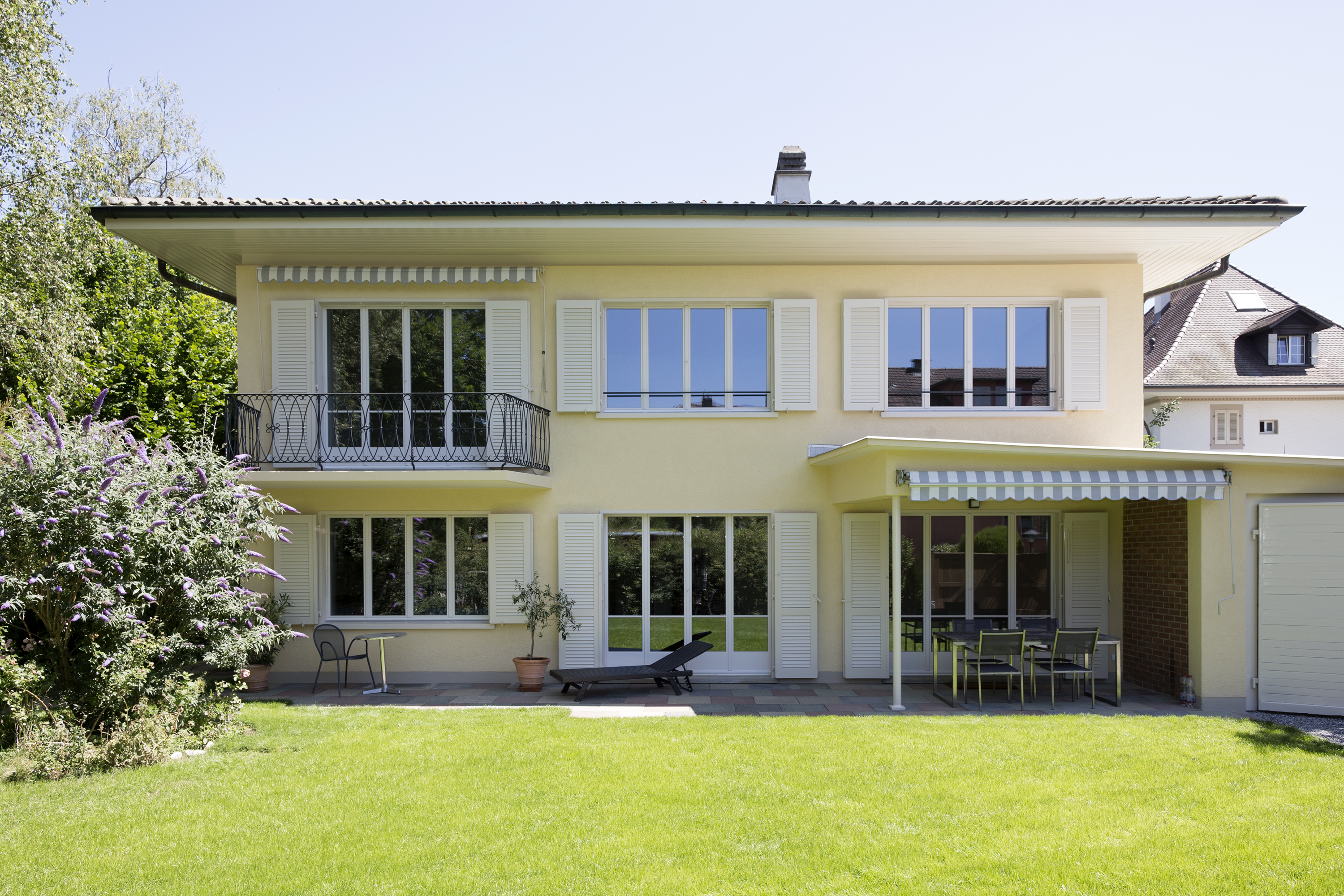 Der ehemals abgetrennte Eingangsbereich wurde zu einem grosszügigen Entrée erweitert und das anliegende Treppenhaus durch die neue Material- und Farbgestaltung in den Wohnbereich eingebunden. Mittels einem grosszügigen Wanddurchbruch wurde der neue Küchenstandort zum Ess- und Wohnzimmer hin geöffnet. Der Grundriss im Obergeschoss wurde nicht verändert. Die Nasszellen sind grunderneuert worden und im OG wurde eine zusätzliche Dusche mit WC eingebaut. Es wurde ein dezentes Farbkonzept umgesetzt und die Wohnräume mit neuen Einbauten ergänzt. Die Elektro-, Sanitär und Heizungsinstallationen wurden komplett ersetzt; die Wärmeerzeugung erfolgt mittels einer Wärmepumpe mit Erdsonde. Der Dachgeschossboden und die Kellerdecke wurden nach energetischen Vorschriften gedämmt. Die Fassade und die Fensterläden wurden neu gestrichen. Die Gartenanlage mit gedecktem Aussensitzplatz wurde mehrheitlich in ihrem Originalzustand belassen.