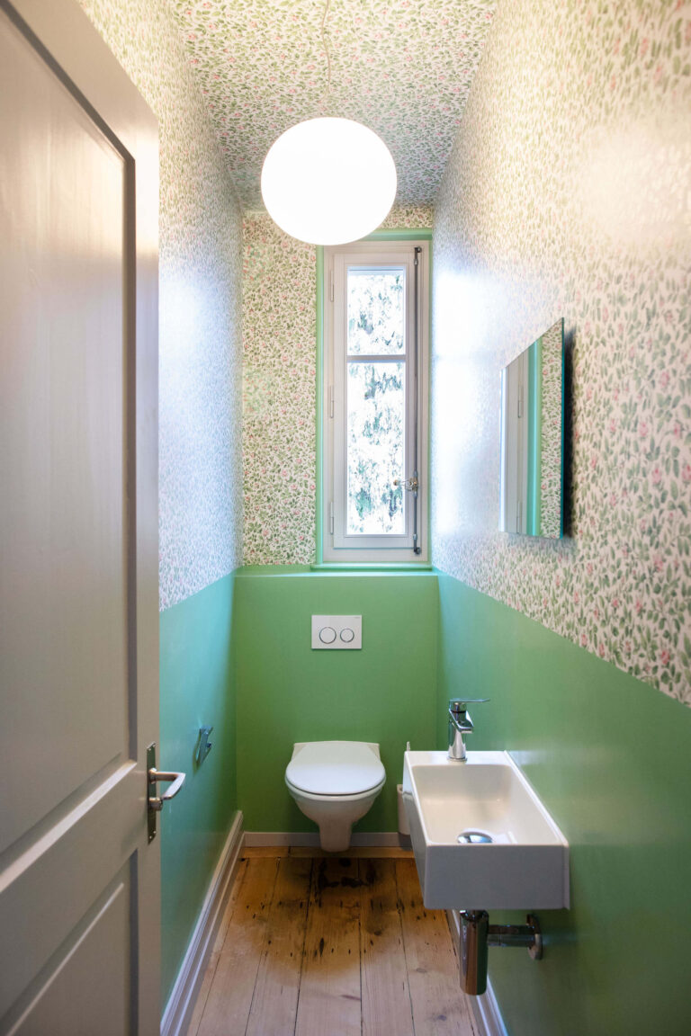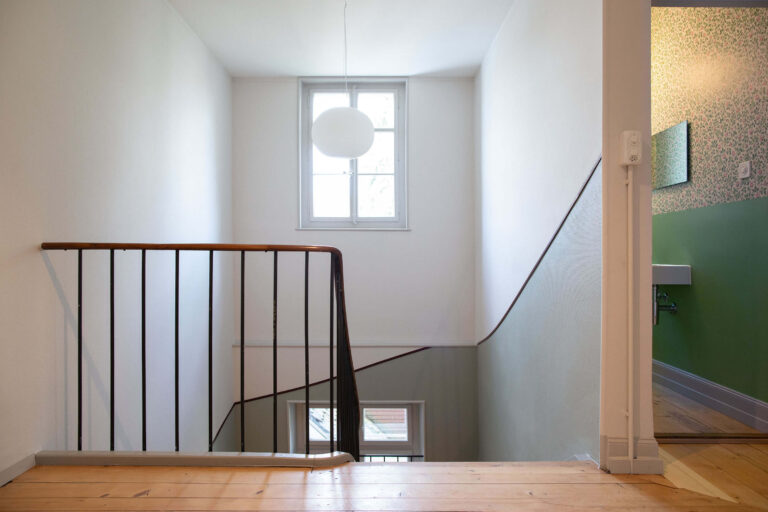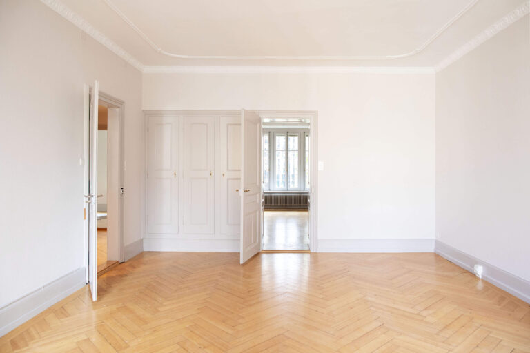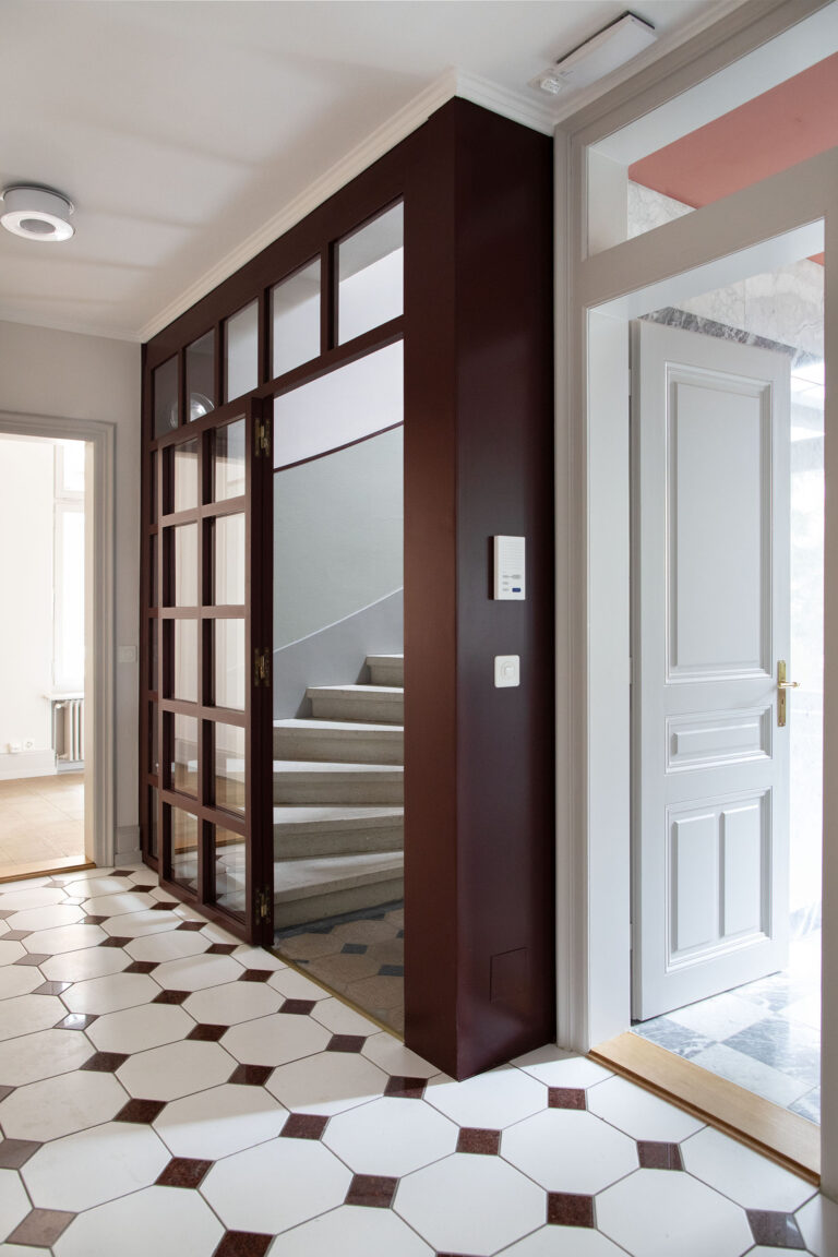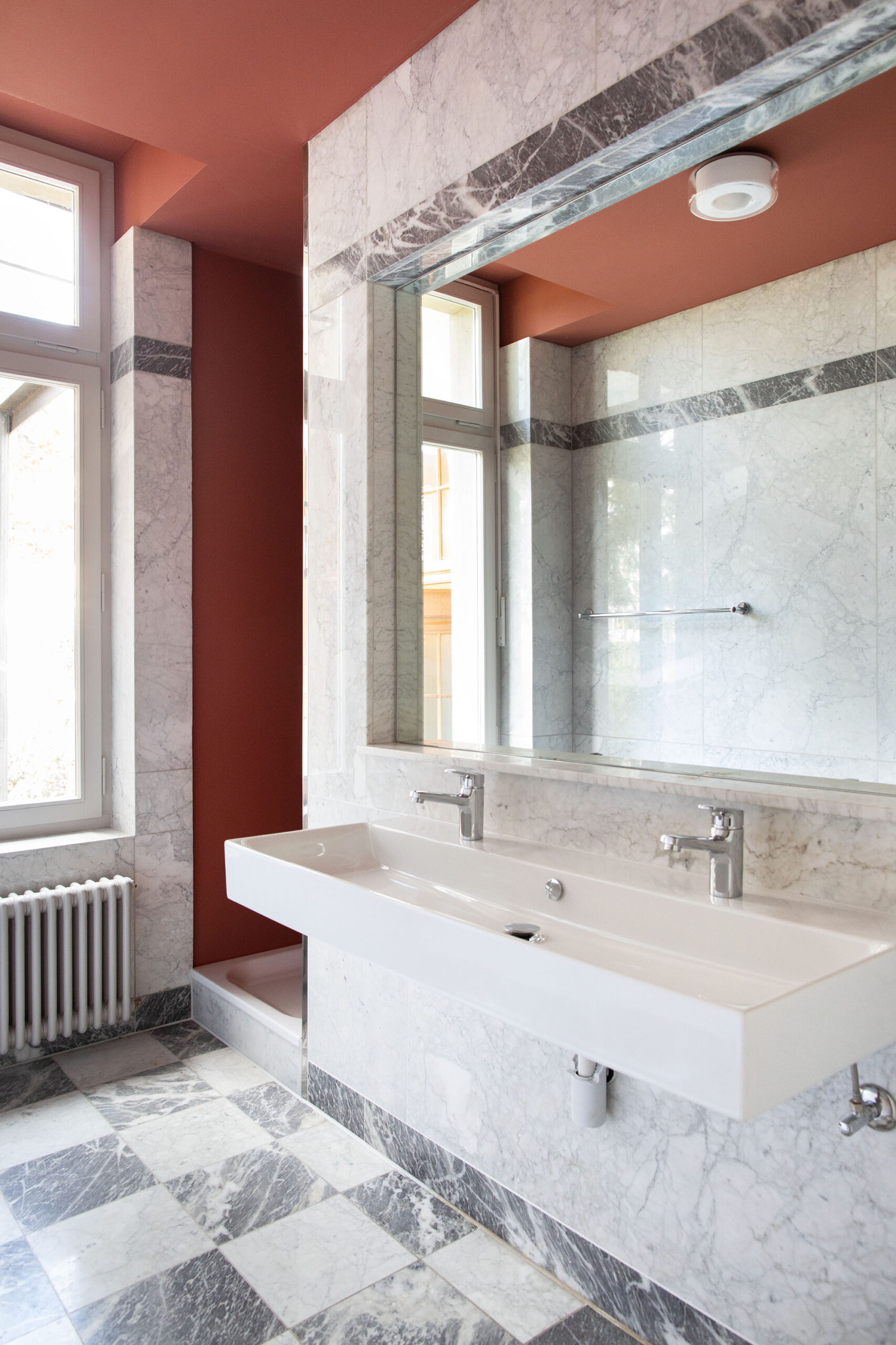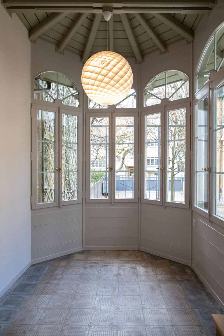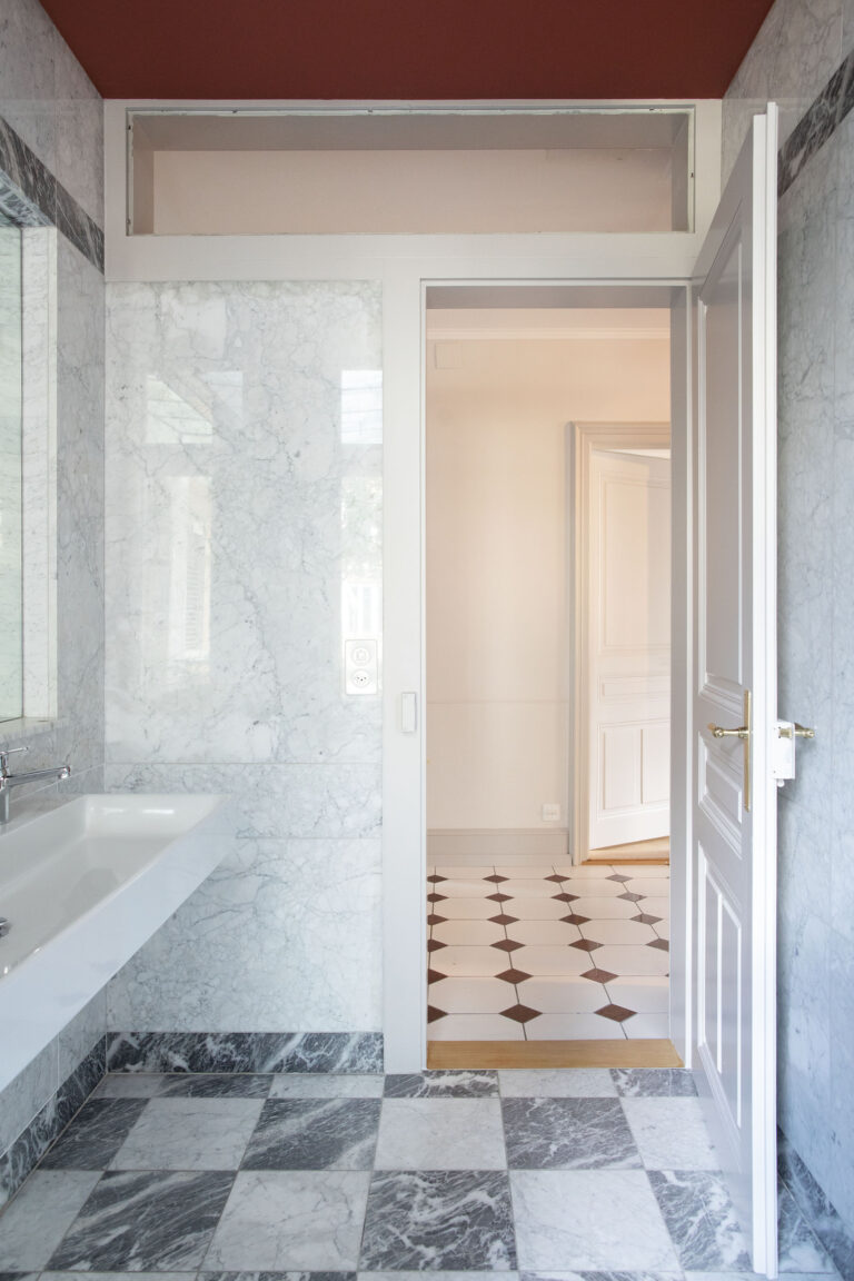 Das Hauptmerkmal dieser Sanierung war die pragmatische Herangehensweise. Hinter den Einbauten der letzten Jahrzehnte liess sich der Charme der ursprünglichen Räume noch erahnen. Im Sinne einer ganzheitlichen Nachhaltigkeit wurden Eingriffe nur da vorgenommen, wo sie wirklich nötig waren. So wurde bereits bei der ersten Begehung definiert, welche der alten Bauteile erhalten resp. wieder hervorgeholt und durch ein neues Farbkonzept ergänzt werden. Diese Vorgehensweise konnte nur umgesetzt werden, da Bauherrschaft und Planende am gleichen Strang gezogen haben. Alte Einbauten wurden ausgebaut, Laminat- und Teppichböden entfernt und die darunterliegenden Parkett- und Steinböden wieder hergestellt. Flickstellen wurden akzeptiert und als solche gezeigt. Die Nutzungsanpassungen im Bereich der Nasszellen konnten durch geringe Eingriffe umgesetzt werden. Die bestehenden und qualitativ hochwertigen Marmorplatten wurden belassen und in ein stimmiges Farb- und Beleuchtungskonzept integriert. Die ebenfalls bestehende hochwertige Küche wies eine nicht mehr zeitgemässe Farboberfläche und einige mechanische Defekte auf. Anstelle eines Ersatzes wurden nur einzelne Komponente ausgetauscht und die Oberflächen neu gestrichen. Im Treppenhaus wurden der Naturstein sowie das Parkett wieder hervorgeholt. Die neuen Farben im Treppenhaus und in der Küche integrieren sich in den Farbraum der bestehenden Plattenbeläge und der Kachelöfen.