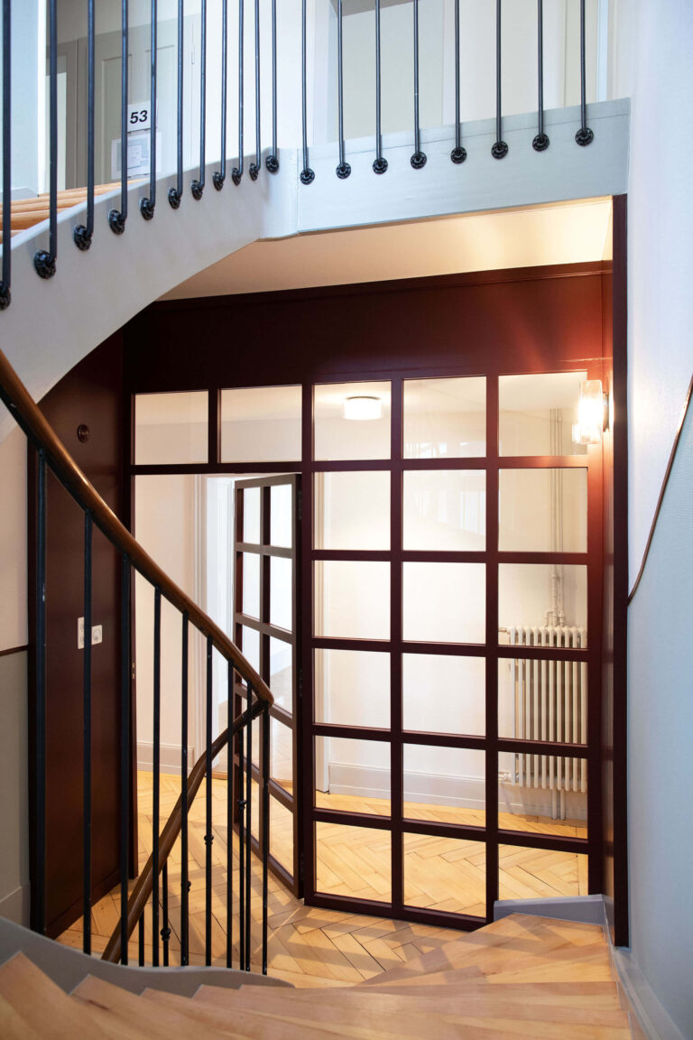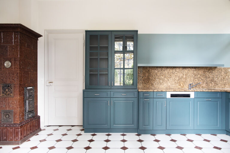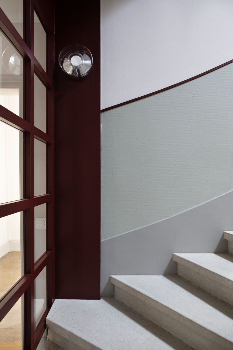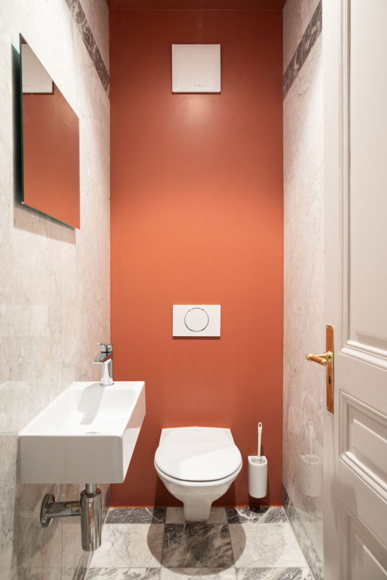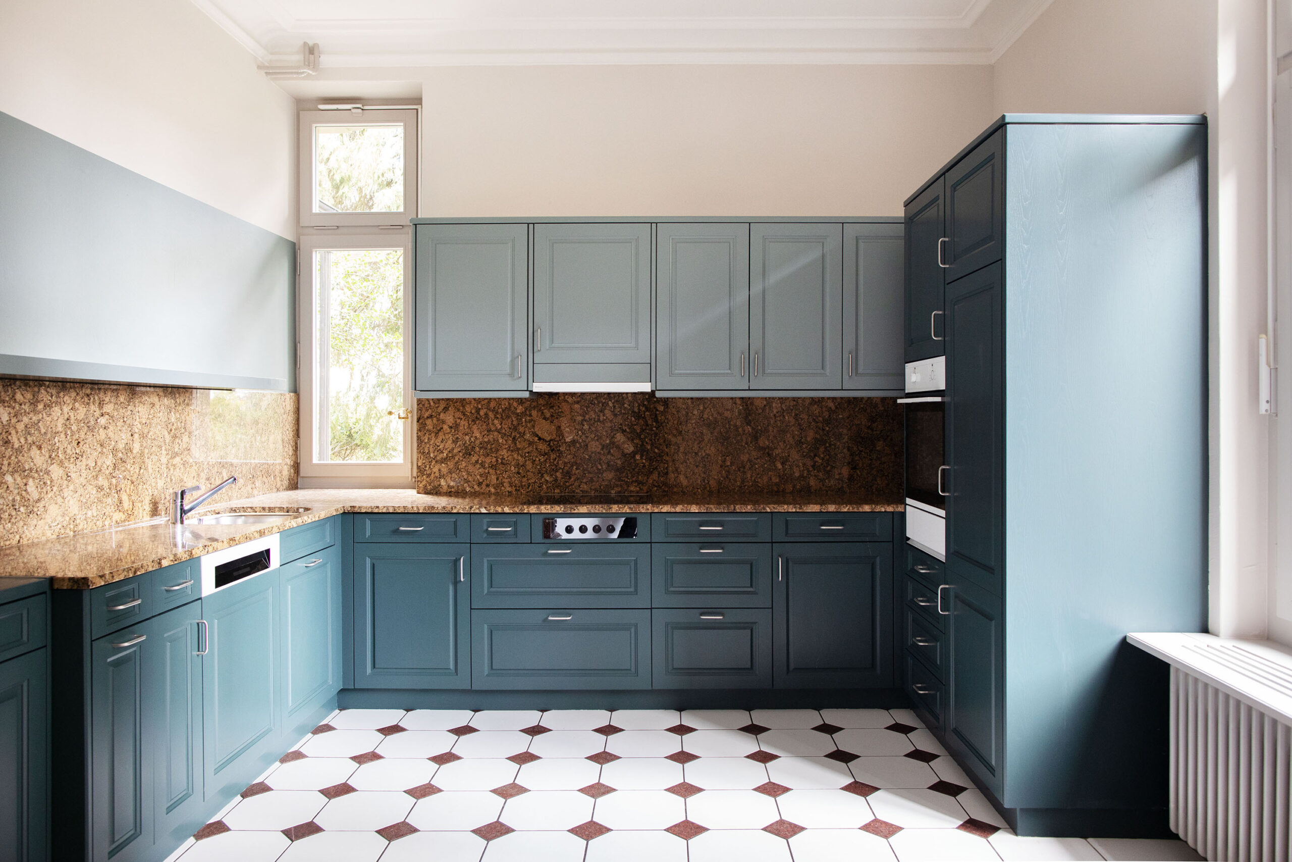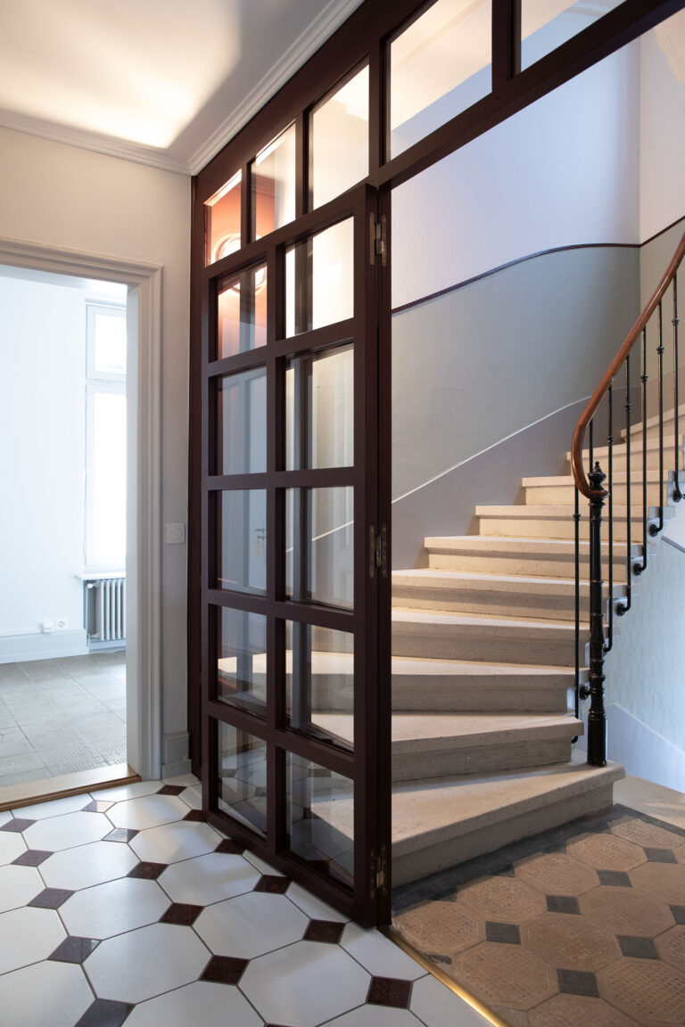 Das Hauptmerkmal dieser Sanierung war die pragmatische Herangehensweise. Hinter den Einbauten der letzten Jahrzehnte liess sich der Charme der ursprünglichen Räume noch erahnen. Im Sinne einer ganzheitlichen Nachhaltigkeit wurden Eingriffe nur da vorgenommen, wo sie wirklich nötig waren. So wurde bereits bei der ersten Begehung definiert, welche der alten Bauteile erhalten resp. wieder hervorgeholt und durch ein neues Farbkonzept ergänzt werden. Diese Vorgehensweise konnte nur umgesetzt werden, da Bauherrschaft und Planende am gleichen Strang gezogen haben. Alte Einbauten wurden ausgebaut, Laminat- und Teppichböden entfernt und die darunterliegenden Parkett- und Steinböden wieder hergestellt. Flickstellen wurden akzeptiert und als solche gezeigt. Die Nutzungsanpassungen im Bereich der Nasszellen konnten durch geringe Eingriffe umgesetzt werden. Die bestehenden und qualitativ hochwertigen Marmorplatten wurden belassen und in ein stimmiges Farb- und Beleuchtungskonzept integriert. Die ebenfalls bestehende hochwertige Küche wies eine nicht mehr zeitgemässe Farboberfläche und einige mechanische Defekte auf. Anstelle eines Ersatzes wurden nur einzelne Komponente ausgetauscht und die Oberflächen neu gestrichen. Im Treppenhaus wurden der Naturstein sowie das Parkett wieder hervorgeholt. Die neuen Farben im Treppenhaus und in der Küche integrieren sich in den Farbraum der bestehenden Plattenbeläge und der Kachelöfen.
