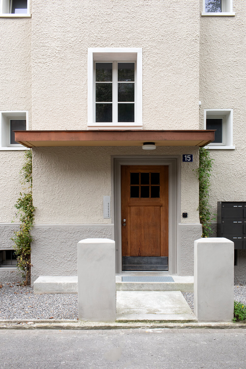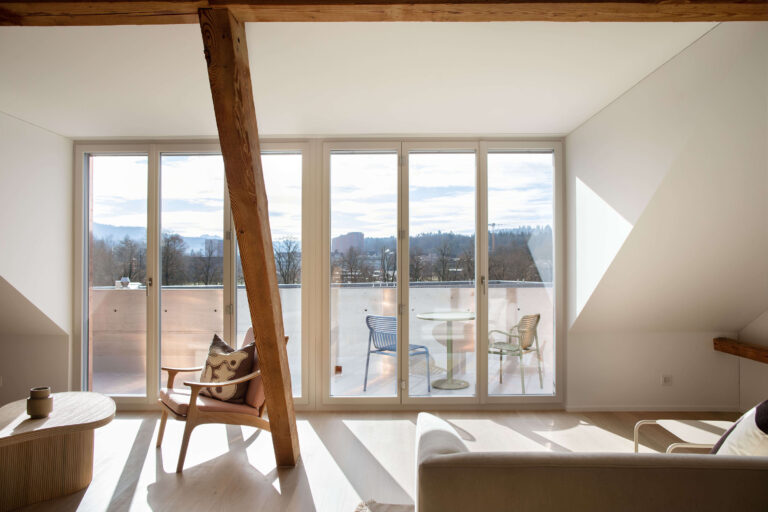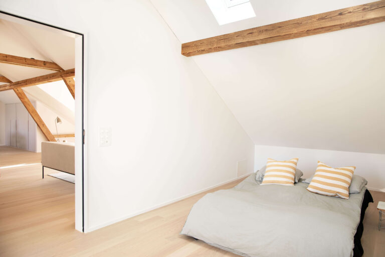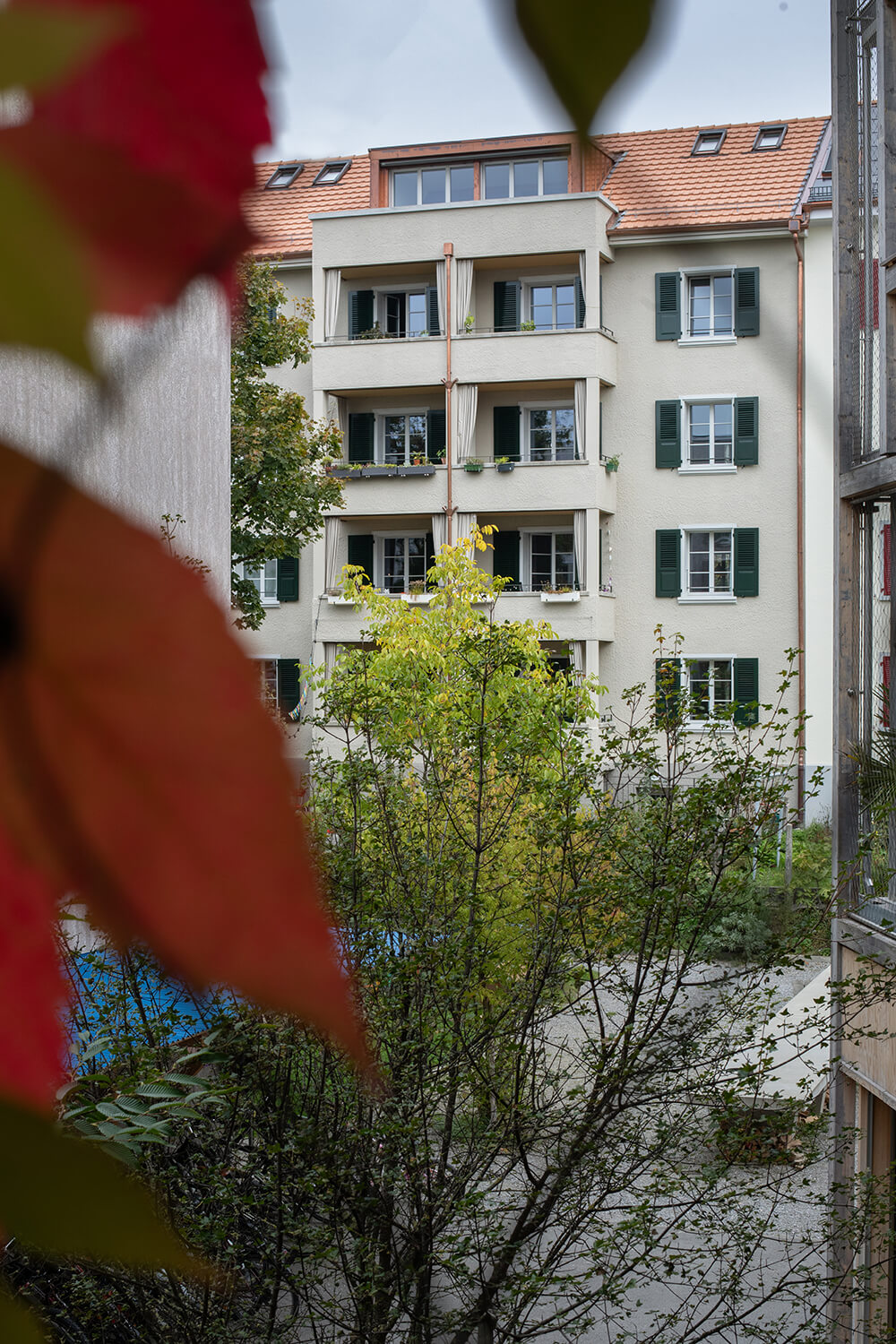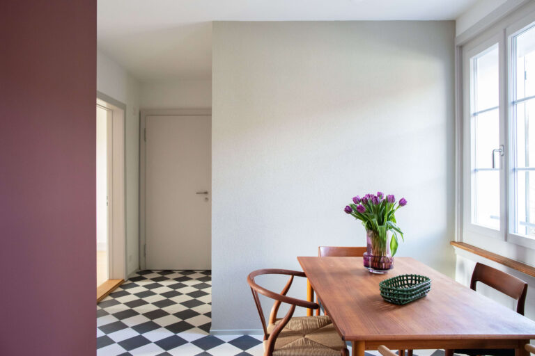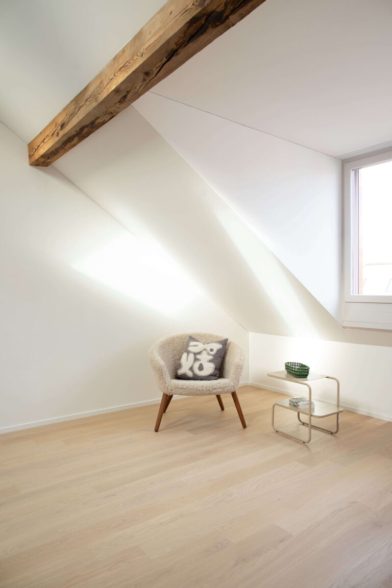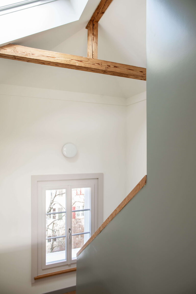 Das Mehrfamilienhaus liegt eingebettet in einer formal von der Moderne beeinflussten Mehrfamilienhauszeile und bildete ursprünglich den Abschluss zu einem Schrebergartengelände, auf dem vor einigen Jahren mit der Überbauung Hubergasse und dem Stadtteilpark Holligen ein neuer Akzent im Quartier gesetzt wurde. Eine mineralischen Fassadendämmung ertüchtigt neu das Gebäude, die Fenster -und Türgewände mussten wegen der Mehrtiefe ersetzt werden. Ebenfalls wurden die Fenster ersetzt (Holz, 3-fach IV). Das Dach und die Kellerdecke wurden gedämmt. HLS- und Elektroinstallationen mussten komplett ersetzt werden und die Liegenschaft wurde an die Fernwärme angeschlossen. Im Innern wurde die Liegenschaft weitgehend auf den Rohbau zurückgeführt und im Bereich Küche und Bad Grundrissanpassungen vorgenommen. Im Dachgeschoss ist der Estrichbereich zu einer grosszügigen 2.5-Zimmerwohnung mit 3 Lukarnen, offener Küche mit Wohn- und Essbereich, Nasszelle und einem abschliessbaren Zimmer ausgebaut worden. Der bestehende Balkonturm wurde bis ins DG erweitert. Der nach Süden ausgerichtete Wohnbereich mit dem vorliegenden Balkon bietet nun Aussicht bis zu den Alpen. Der Aufgang zur DG-Wohnung ist neu gestaltet und entspricht den gültigen Brandschutzanforderungen. Das Farb- und Materialisierungskonzept in den Wohnungen und im Treppenhaus wurde in Zusammenarbeit mit der Bauherrschaft erarbeitet. Ein kleiner neu gestalteter Naturgarten mit einheimischen Pflanzen und Sitzplatz lädt zum Verweilen im Freien ein.