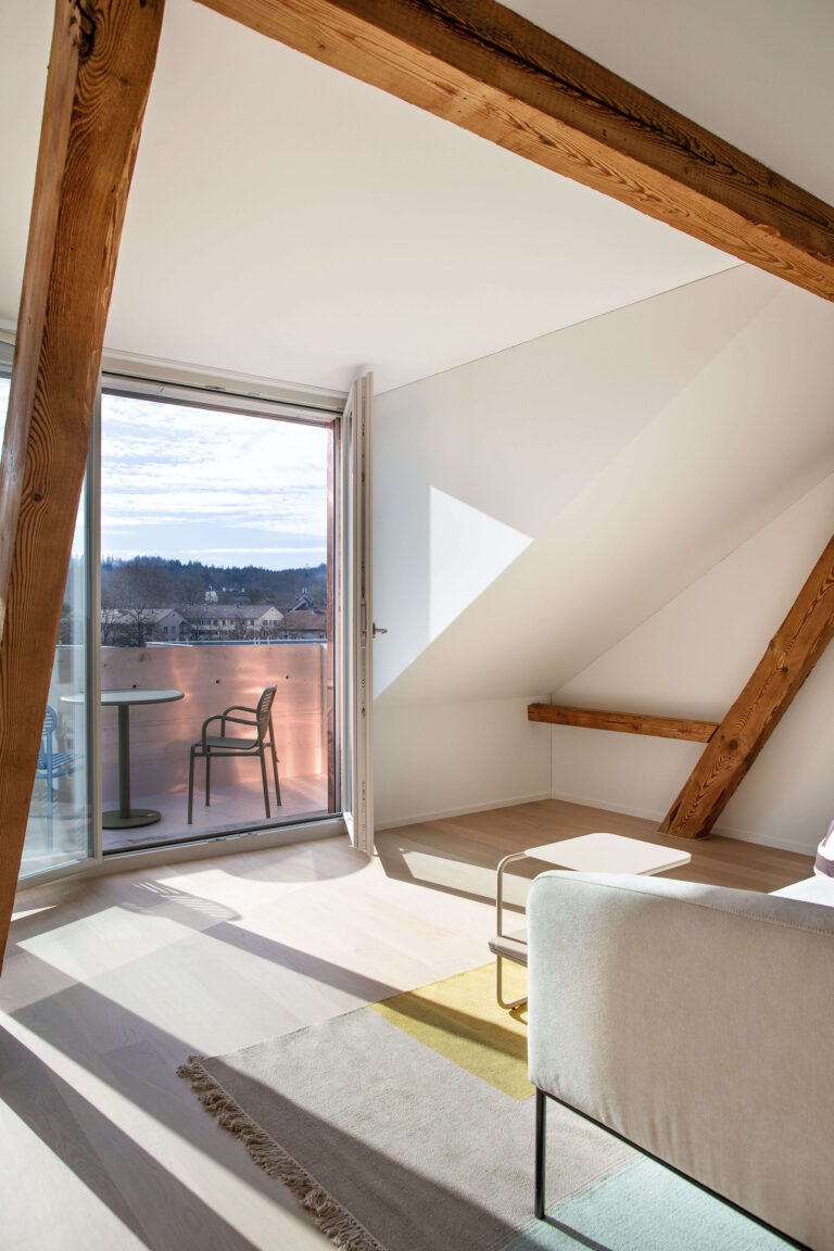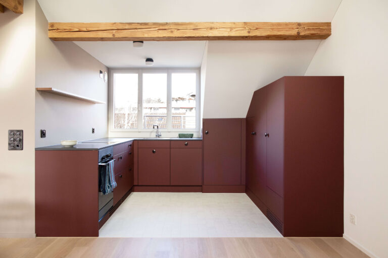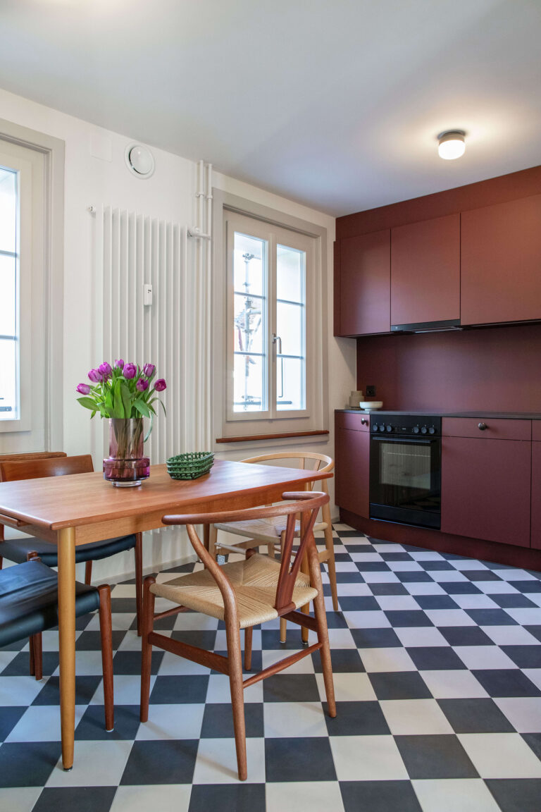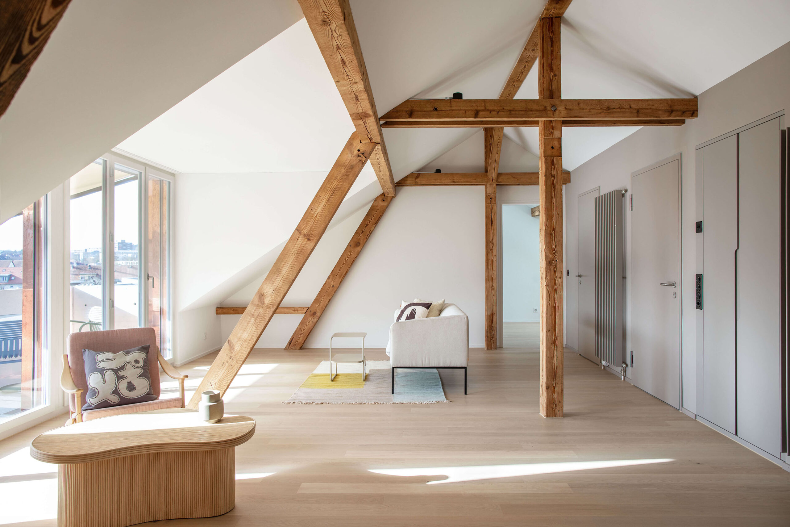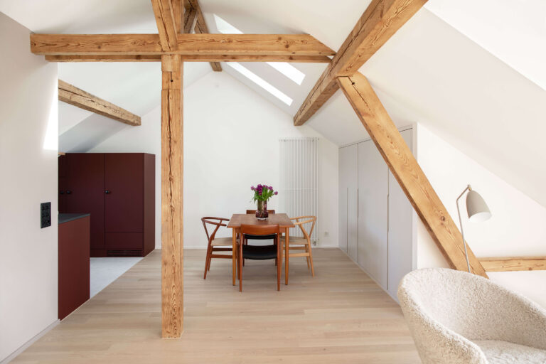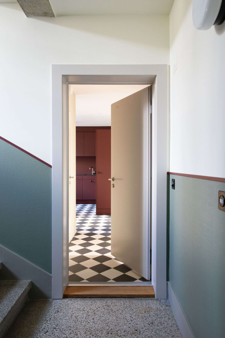 Das Mehrfamilienhaus liegt eingebettet in einer formal von der Moderne beeinflussten Mehrfamilienhauszeile und bildete ursprünglich den Abschluss zu einem Schrebergartengelände, auf dem vor einigen Jahren mit der Überbauung Hubergasse und dem Stadtteilpark Holligen ein neuer Akzent im Quartier gesetzt wurde. Eine mineralischen Fassadendämmung ertüchtigt neu das Gebäude, die Fenster -und Türgewände mussten wegen der Mehrtiefe ersetzt werden. Ebenfalls wurden die Fenster ersetzt (Holz, 3-fach IV). Das Dach und die Kellerdecke wurden gedämmt. HLS- und Elektroinstallationen mussten komplett ersetzt werden und die Liegenschaft wurde an die Fernwärme angeschlossen. Im Innern wurde die Liegenschaft weitgehend auf den Rohbau zurückgeführt und im Bereich Küche und Bad Grundrissanpassungen vorgenommen. Im Dachgeschoss ist der Estrichbereich zu einer grosszügigen 2.5-Zimmerwohnung mit 3 Lukarnen, offener Küche mit Wohn- und Essbereich, Nasszelle und einem abschliessbaren Zimmer ausgebaut worden. Der bestehende Balkonturm wurde bis ins DG erweitert. Der nach Süden ausgerichtete Wohnbereich mit dem vorliegenden Balkon bietet nun Aussicht bis zu den Alpen. Der Aufgang zur DG-Wohnung ist neu gestaltet und entspricht den gültigen Brandschutzanforderungen. Das Farb- und Materialisierungskonzept in den Wohnungen und im Treppenhaus wurde in Zusammenarbeit mit der Bauherrschaft erarbeitet. Ein kleiner neu gestalteter Naturgarten mit einheimischen Pflanzen und Sitzplatz lädt zum Verweilen im Freien ein.