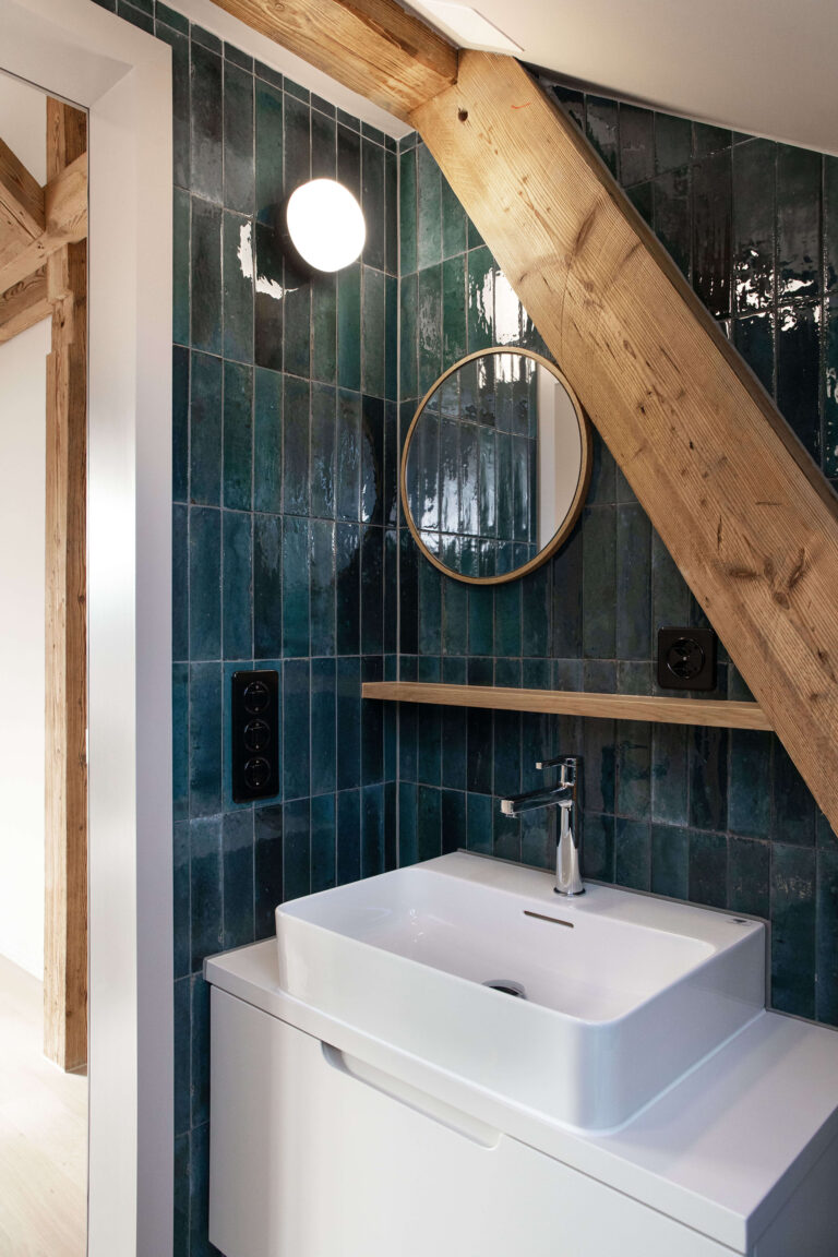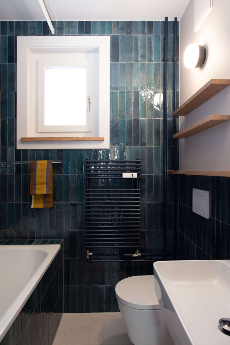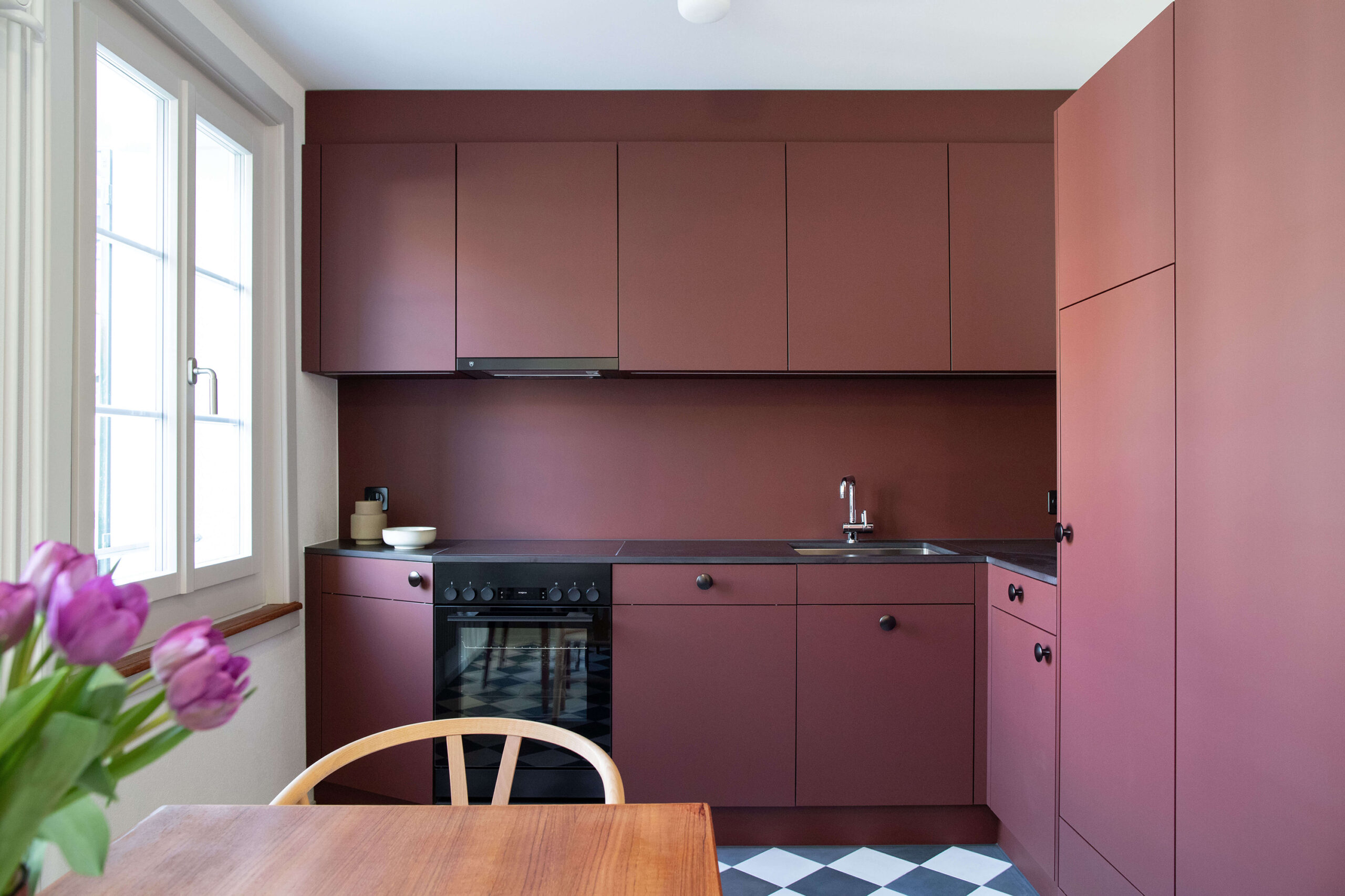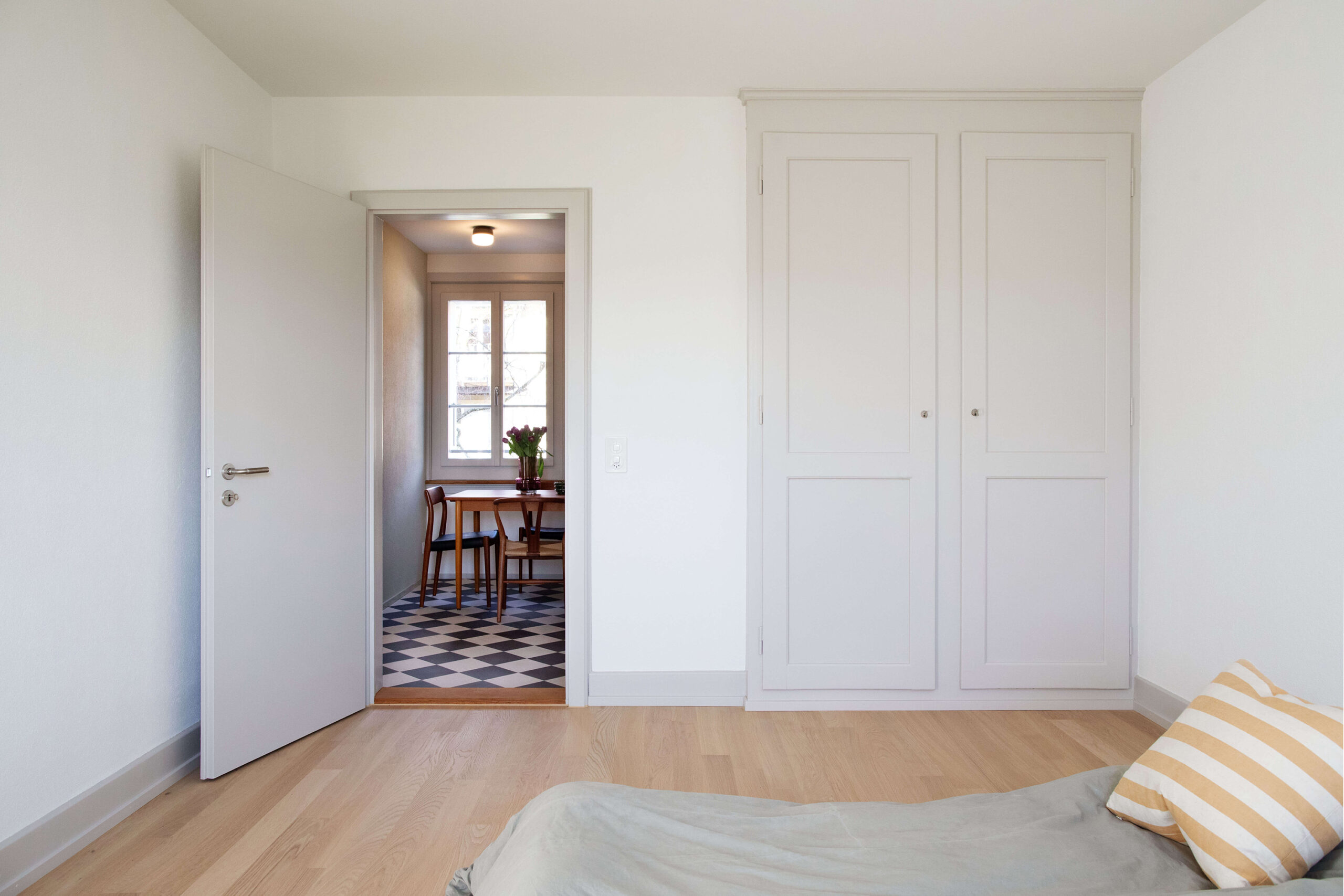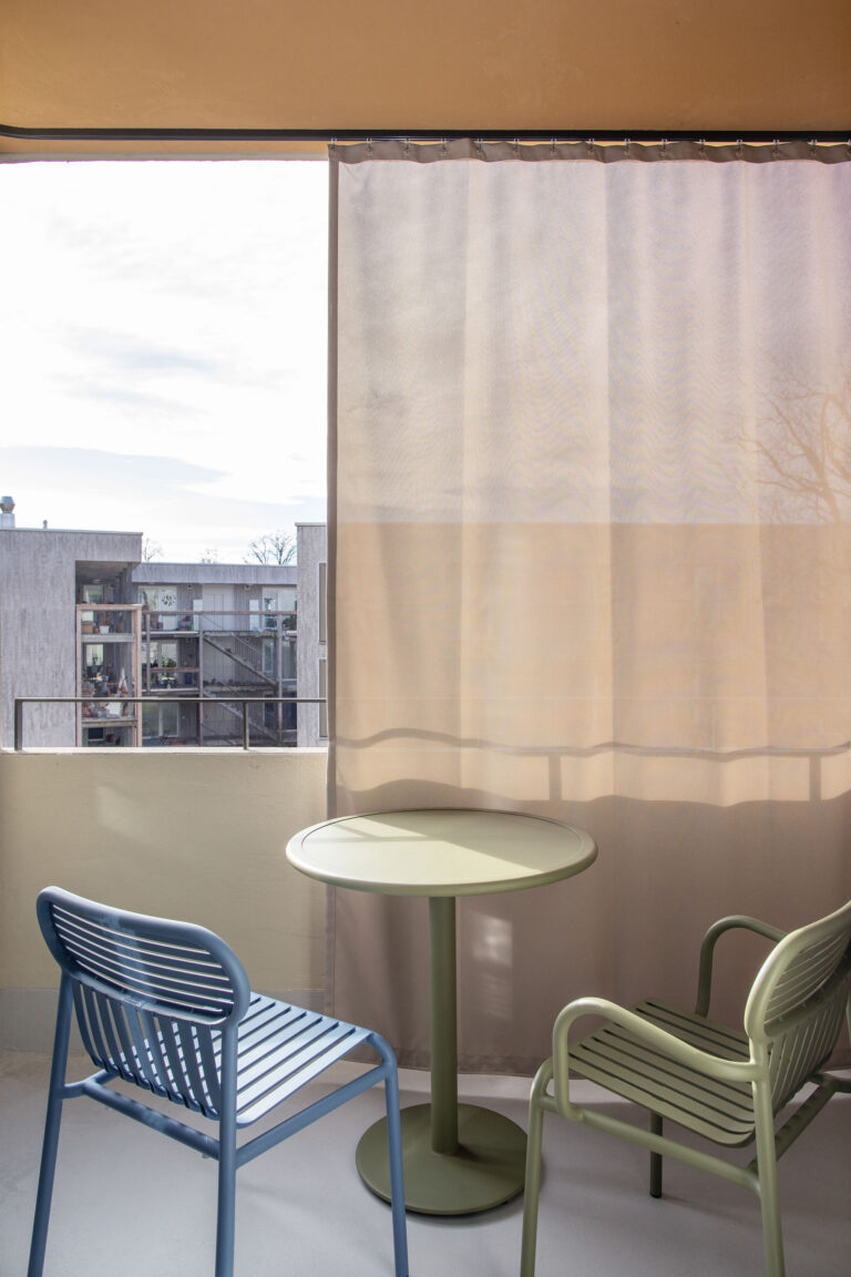Das Mehrfamilienhaus liegt eingebettet in einer formal von der Moderne beeinflussten Mehrfamilienhauszeile und bildete ursprünglich den Abschluss zu einem Schrebergartengelände, auf dem vor einigen Jahren mit der Überbauung Hubergasse und dem Stadtteilpark Holligen ein neuer Akzent im Quartier gesetzt wurde. Eine mineralischen Fassadendämmung ertüchtigt neu das Gebäude, die Fenster -und Türgewände mussten wegen der Mehrtiefe ersetzt werden. Ebenfalls wurden die Fenster ersetzt (Holz, 3-fach IV). Das Dach und die Kellerdecke wurden gedämmt. HLS- und Elektroinstallationen mussten komplett ersetzt werden und die Liegenschaft wurde an die Fernwärme angeschlossen. Im Innern wurde die Liegenschaft weitgehend auf den Rohbau zurückgeführt und im Bereich Küche und Bad Grundrissanpassungen vorgenommen. Im Dachgeschoss ist der Estrichbereich zu einer grosszügigen 2.5-Zimmerwohnung mit 3 Lukarnen, offener Küche mit Wohn- und Essbereich, Nasszelle und einem abschliessbaren Zimmer ausgebaut worden. Der bestehende Balkonturm wurde bis ins DG erweitert. Der nach Süden ausgerichtete Wohnbereich mit dem vorliegenden Balkon bietet nun Aussicht bis zu den Alpen. Der Aufgang zur DG-Wohnung ist neu gestaltet und entspricht den gültigen Brandschutzanforderungen. Das Farb- und Materialisierungskonzept in den Wohnungen und im Treppenhaus wurde in Zusammenarbeit mit der Bauherrschaft erarbeitet. Ein kleiner neu gestalteter Naturgarten mit einheimischen Pflanzen und Sitzplatz lädt zum Verweilen im Freien ein.