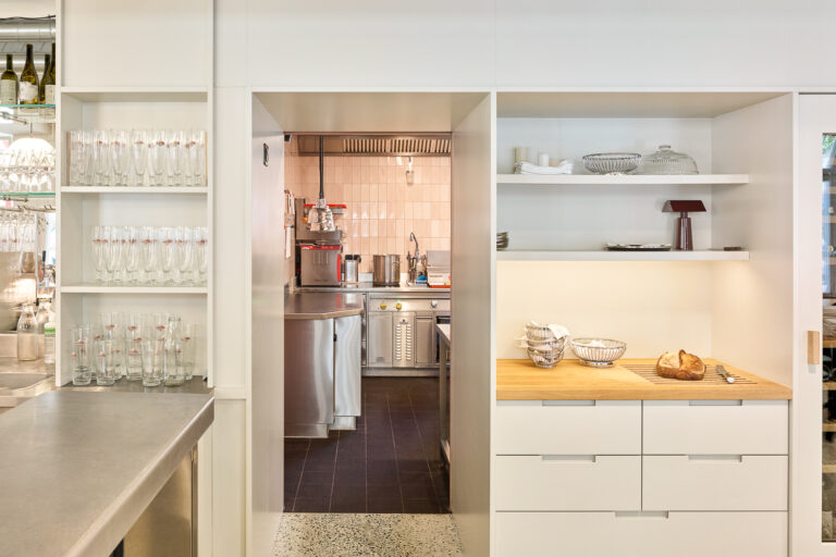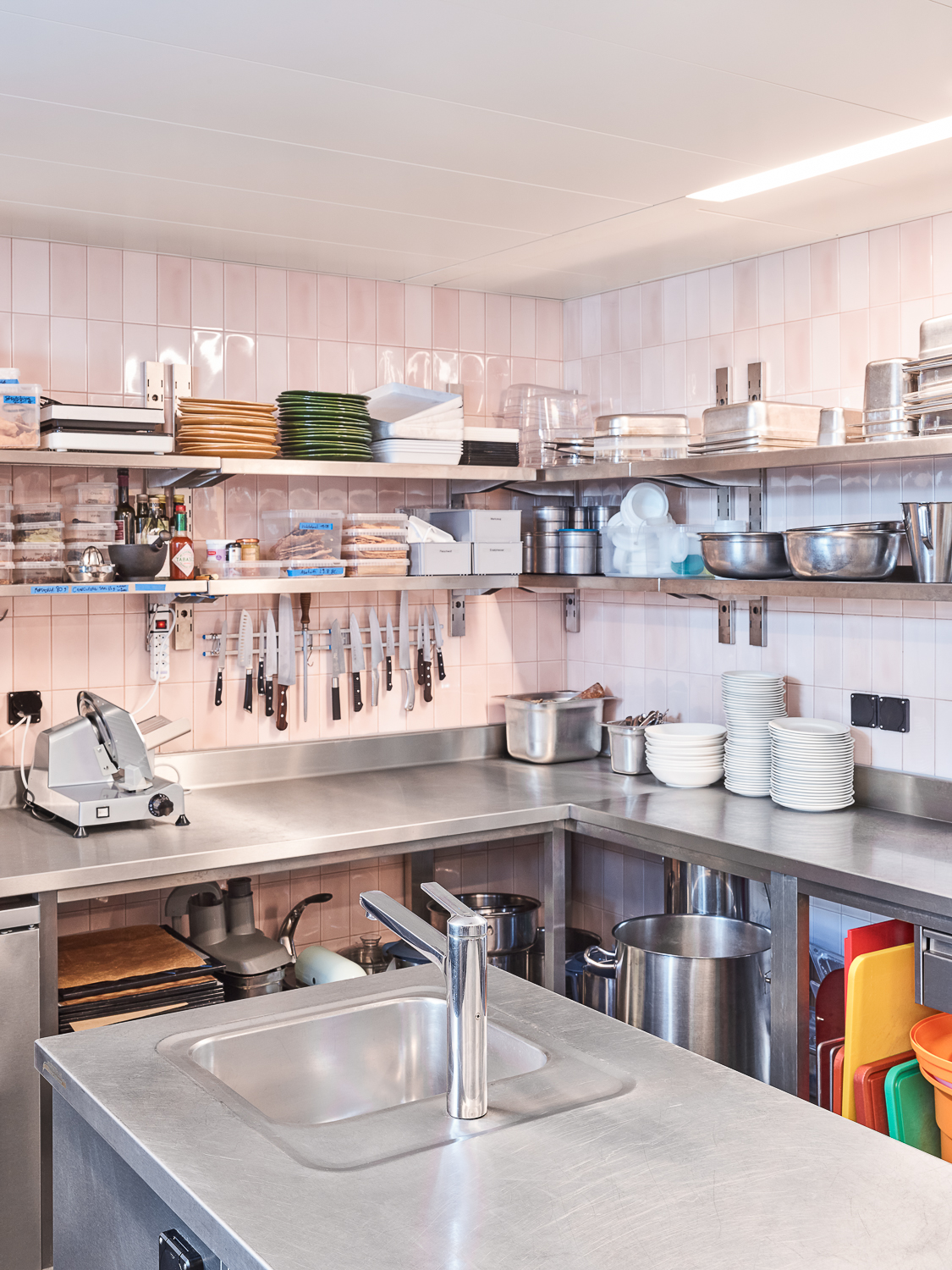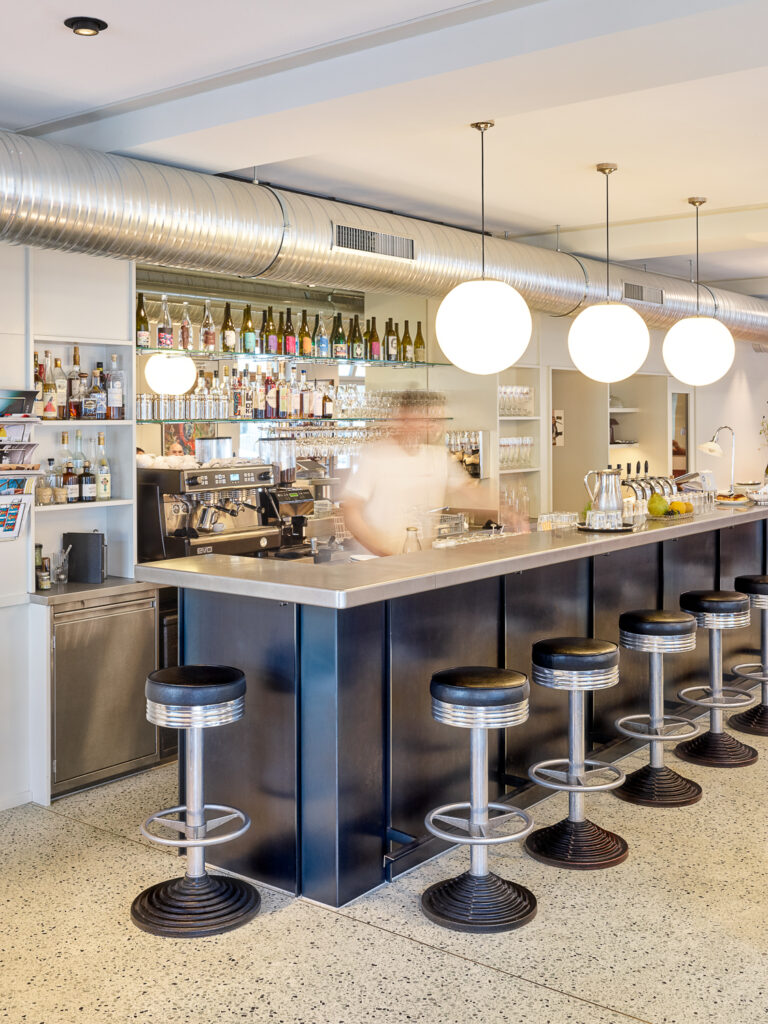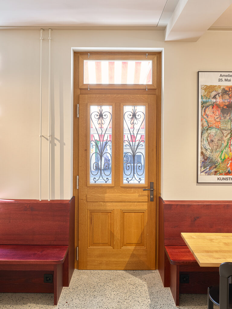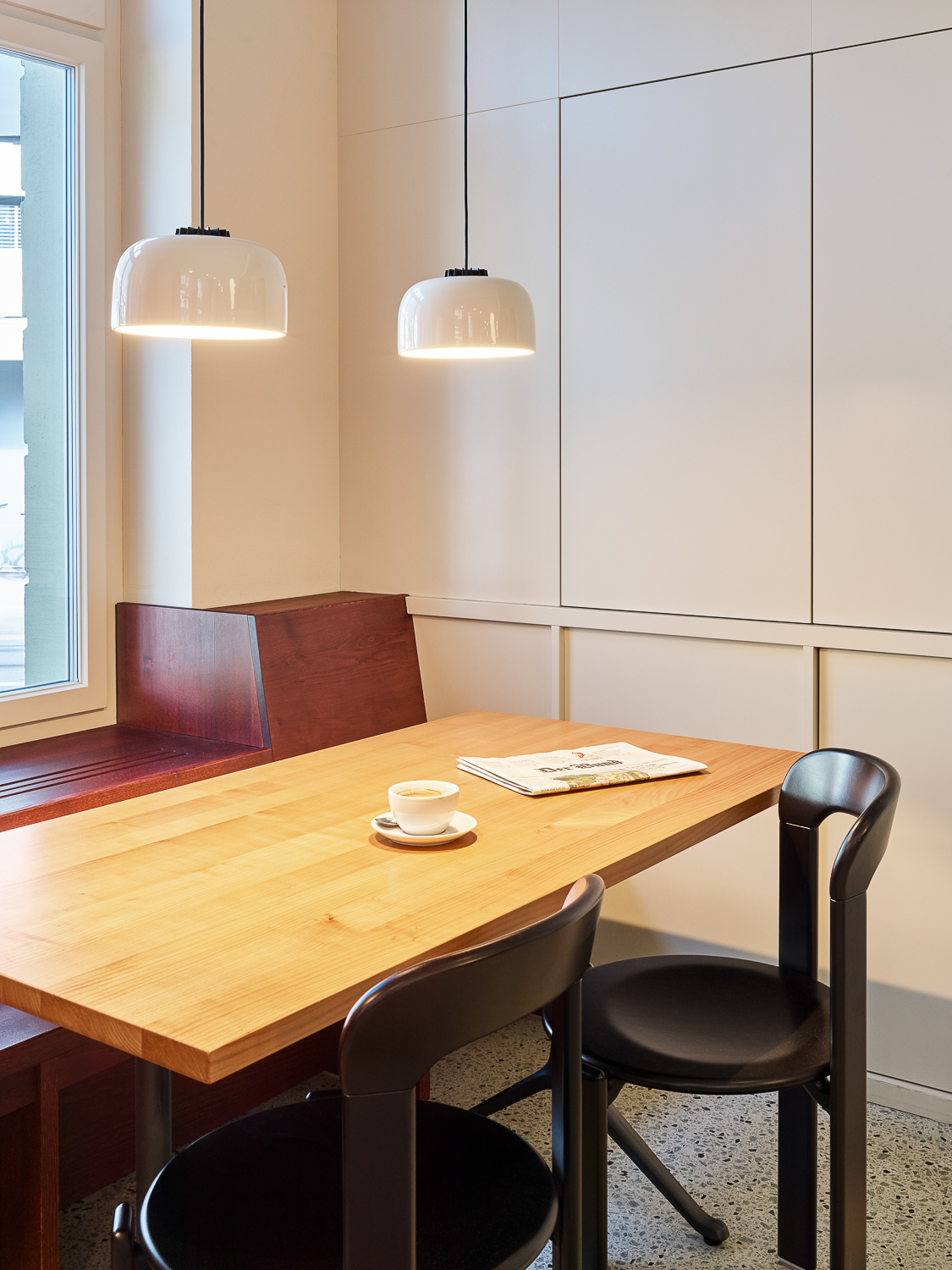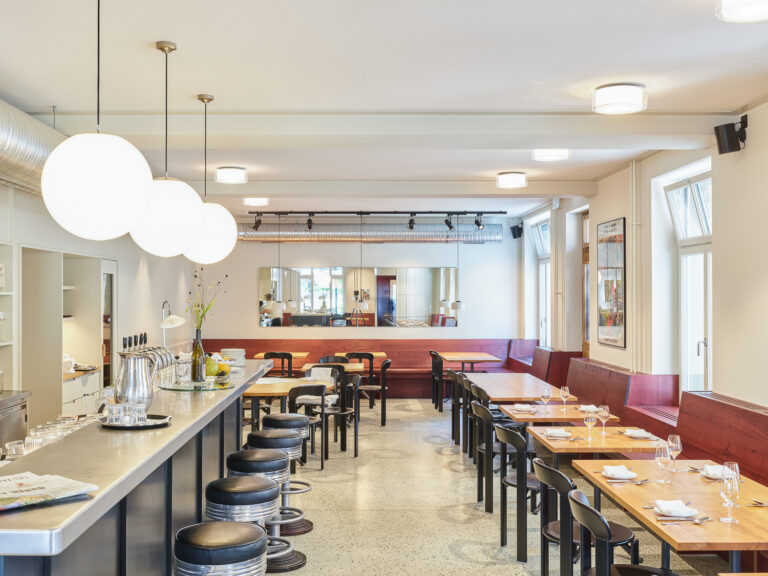 Das Restaurant im Erdgeschoss war bereits seit dem Erstellungsjahr Bestandteil der Liegenschaft am Breitenrainplatz. Es wurde im Verlauf der letzten 120 Jahren mehrmals umgebaut, so dass nur noch wenig historische Bausubstanz erhalten war. Die betriebstechnischen Anforderungen der aktuellen Sanierung bedingten im Bereich der Gastroräume erneut viele räumliche Veränderungen: Die Küche wurde vergrössert, die Bar näher zum Haupteingang verlegt, eine grössere Lüftungsanlage eingebaut und wo früher der Stammtisch stand, ist heute die WC-Anlage organisiert, sie wurde aus dem Untergeschoss in das Erdgeschoss verlegt. Durch den frei gespielten Platz konnte im Untergeschoss zusätzlich zu den Keller- und Technikräumen eine kleine Backstube, eine Personalgarderobe und ein Velokeller eingerichtet werden. Während der Sanierungsplanung wurde, der im Jahr 1974 zugemauerte zweite Ausgang aus dem ursprünglichen Sääli auf die Militärstrasse wieder entdeckt und rekonstruiert. Die unter einer alten Schicht Schallschutzelemente liegende originale Stukaturdecke mit Ornamentbemalung konnte aufgrund der zeitgemässen Sanierungsauflagen zu Brandschutz, Schallschutz und Raumakustik nicht erhalten werden, die Decke wurde komplett neu aufgebaut. Das Materialisierungs- und Beleuchtungskonzept des Restaurants entstand in Zusammenarbeit mit der neuen Pächterschaft und der Lichtplanung. Einige Raumelemente wie der neue Terrazzoboden und die Holzbank wurden in Anlehnung an das Farbkonzept der Liegenschaft entwickelt, andere wie die Gestaltung der Bar, stehen für sich. Im Zuge der Sanierung wurden die historischen Grundrisse der Wohngeschosse wieder hergestellt. In den Räumlichkeiten im 1. Obergeschoss betreibt die Pächterschaft des Restaurant Olympia heute eine kleine Pension.