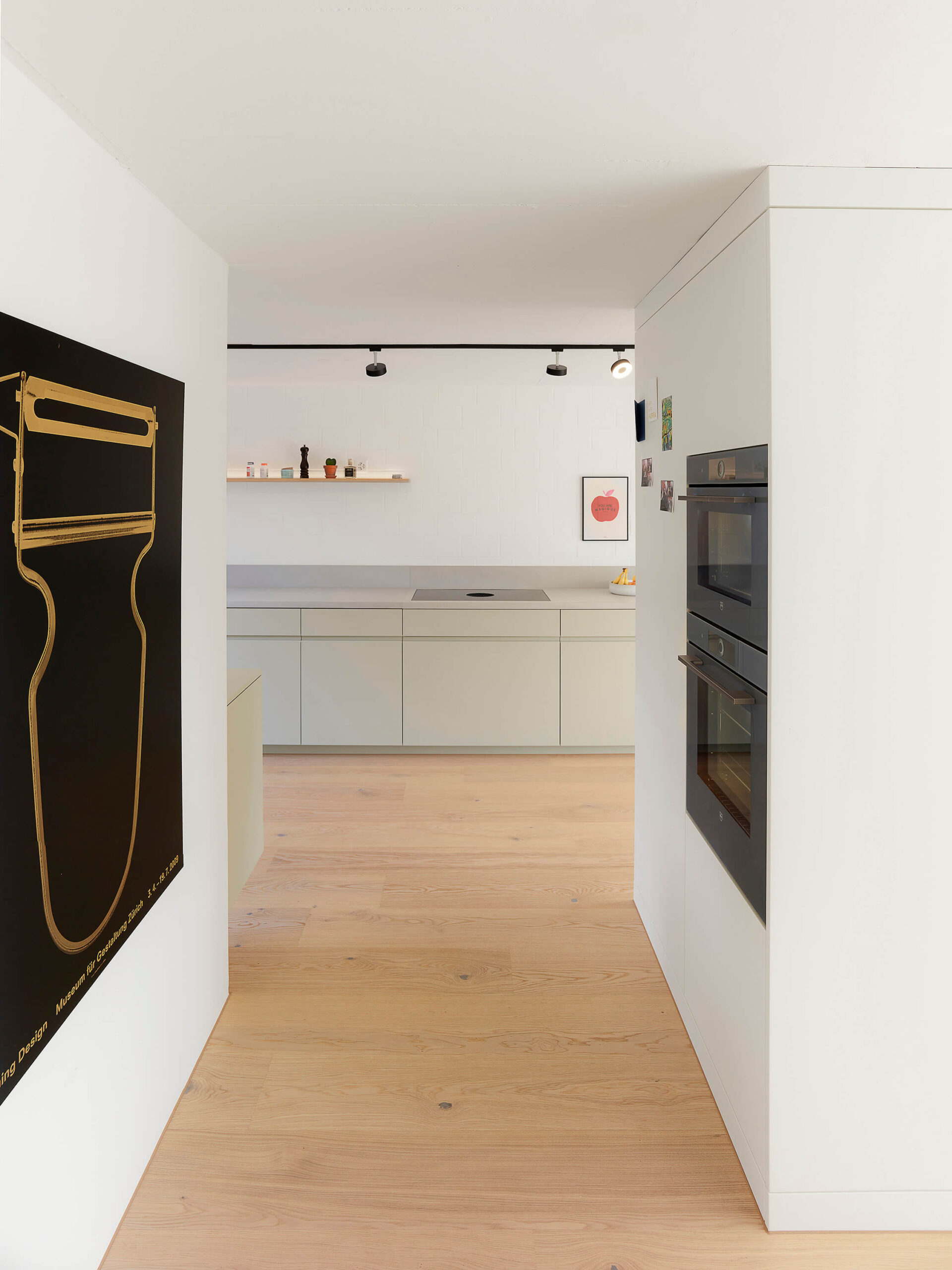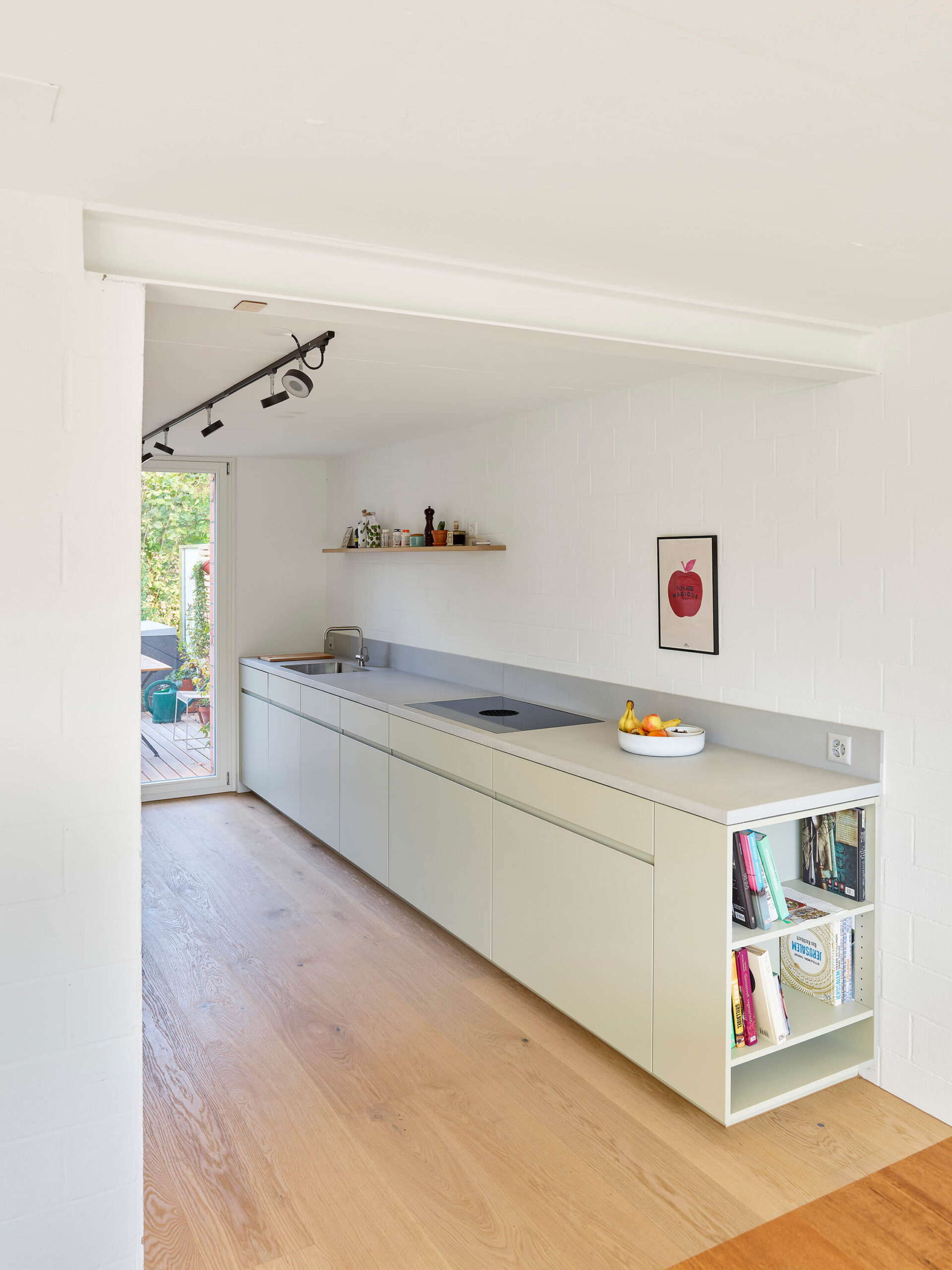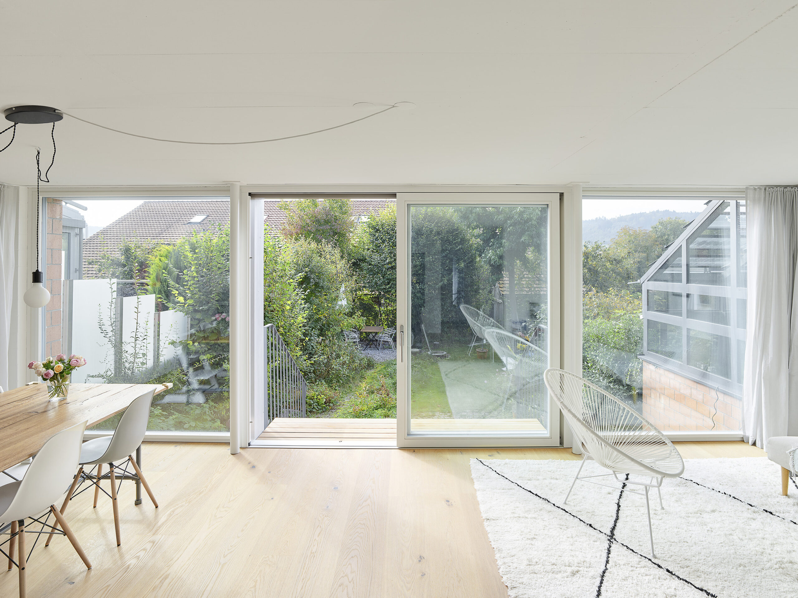 Das Reiheneinfamilienhaus ist Teil einer Wohnsiedlung die in den 1980er Jahren gebaut wurde. Das Haus ist auf zwei Seiten ausgerichtet. Auf der Nordseite wird es über einen schmalen Gehweg erschlossen, im Süden ist die Fassade zum Garten hin ausgerichtet. Die Liegenschaft wurde im Stil der 80er Jahre mit Sichtbacksteinwänden, roher Betondecke und offener Balkenkonstruktion in den oberen Geschossen gebaut. Das Reihenhaus ist zudem als einziges in der Siedlung mit einer Warmluft-Pionierheizung ausgestattet worden. Zur Gewinnung der Warmluft war die Südfassade mit grossen Paneelen bestückt, die Warmluft wurde vertikal durch überdimensionale Rohre in die Räume verteilt. Die gesamten Heizungsinstallationen funktionierten nie richtig und wurden deshalb im Zug der Sanierung zurück gebaut. Im Wohngeschoss konnte dadurch die ehemals mit den Paneelen geschlossene Fassade geöffnet und mit einem grossen Hebe-Schiebefenster und einer neuen Gartentreppe ergänzt werden. Ebenso wurde auf der gegenüberliegenden Seite das Küchenfenster zu einer Gartentüre erweitert, so dass das Wohngeschoss nun zweiseitig mit einem Aussenraum erschlossen ist. Der Wunsch der Bauherrschaft nach mehr Licht und hellen Farben wurde mit einem dezenten Farb- und Materialisierungskonzept entsprochen. Die Sichtbacksteinwände wurden gestrichen und der schwarze Schieferplattenboden durch einen Eichenparkett mit darunter liegender Bodenheizung ersetzt.