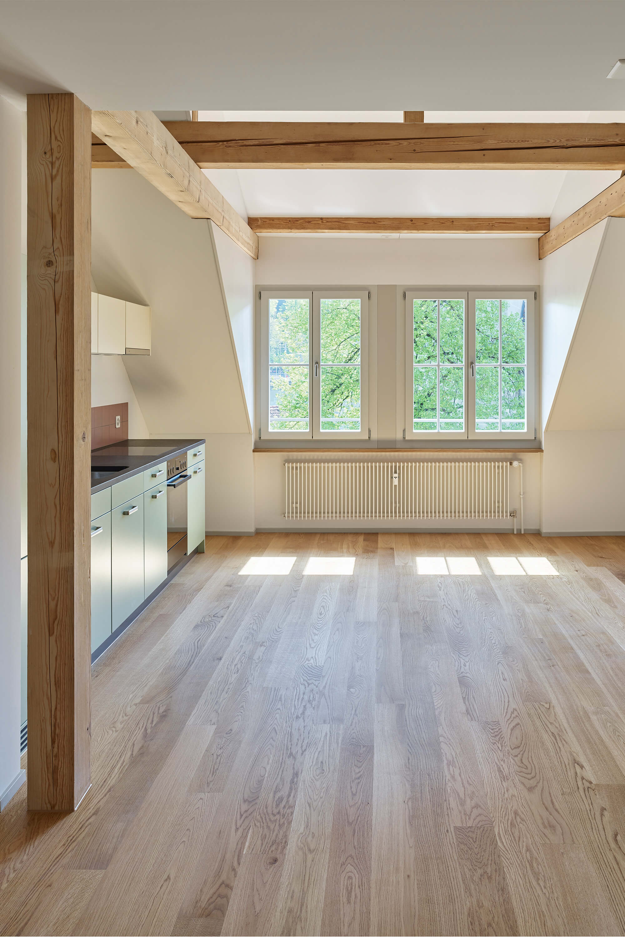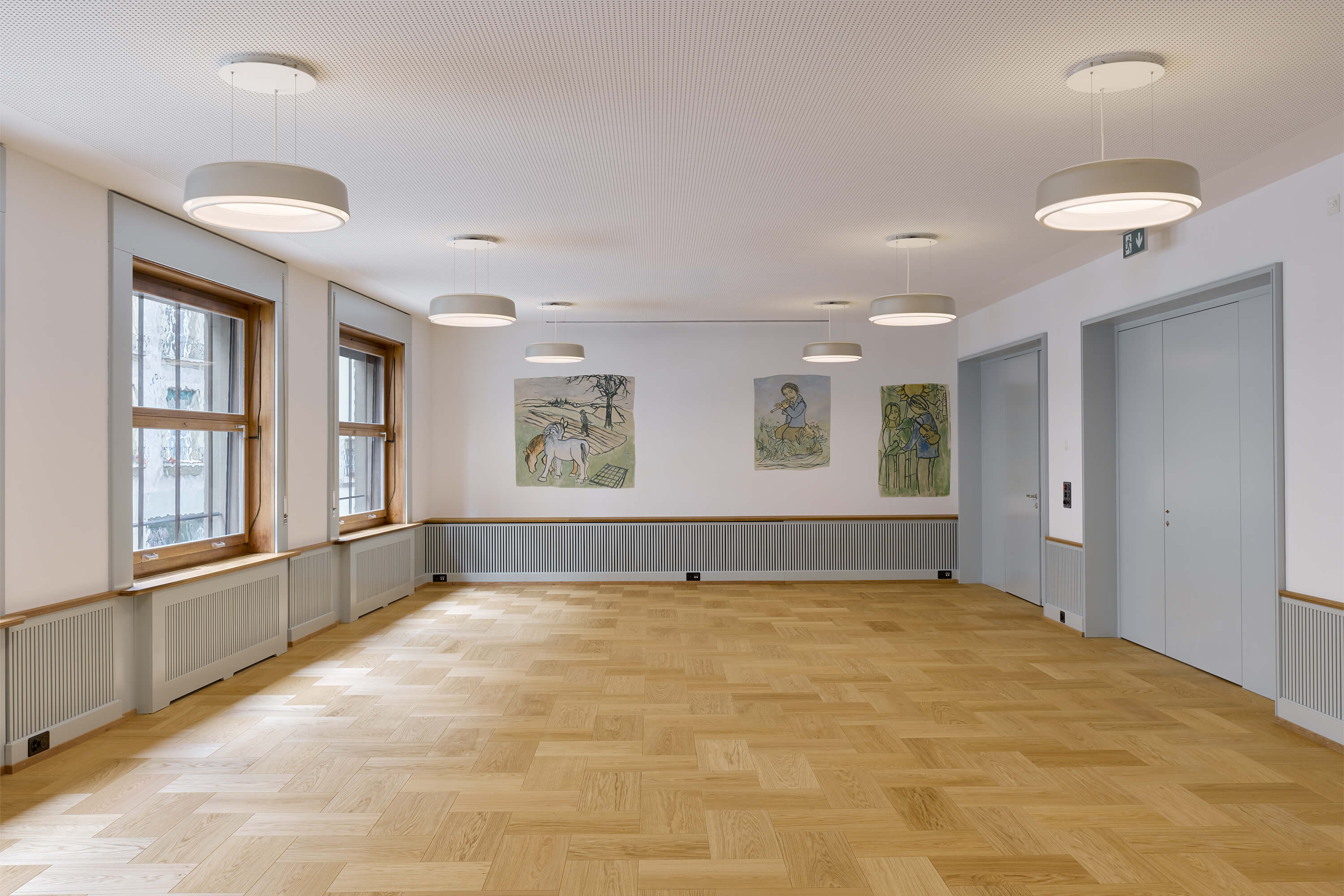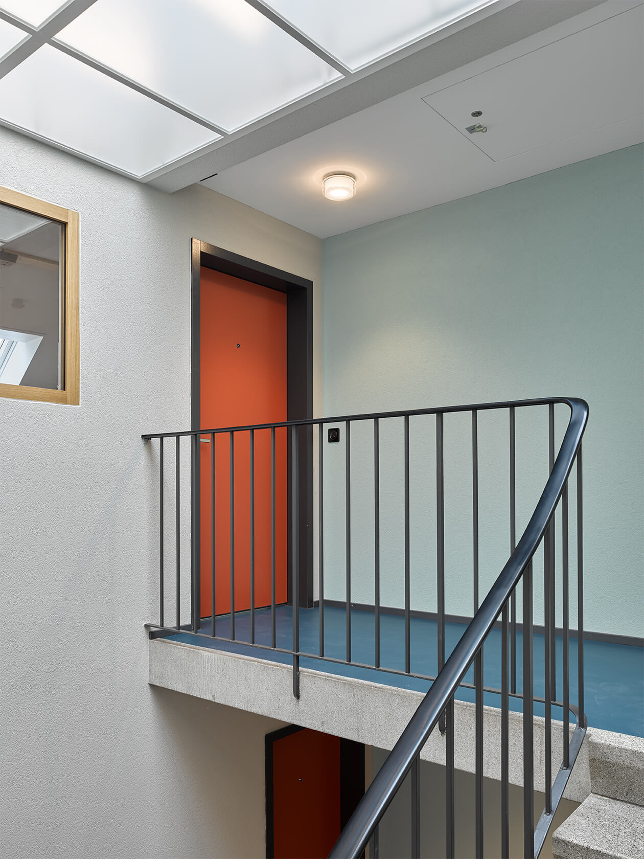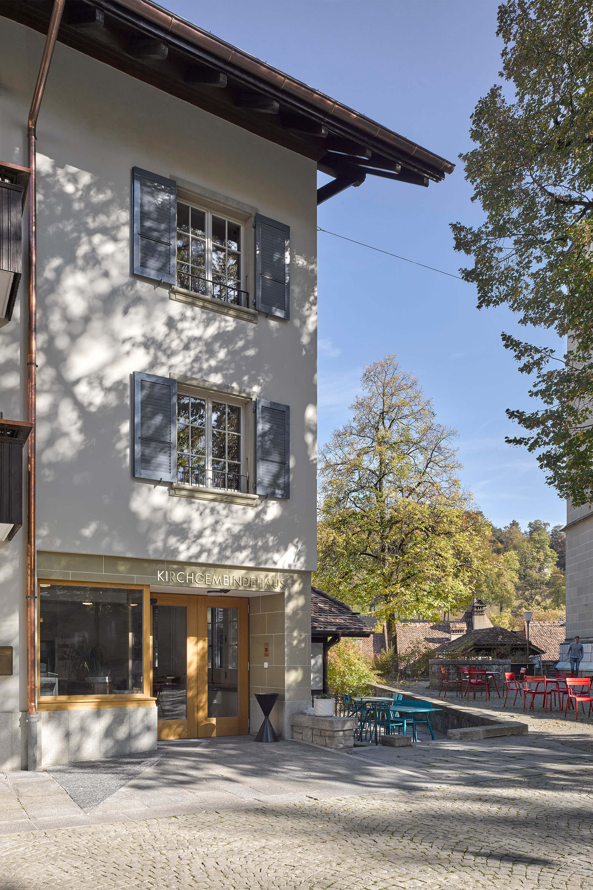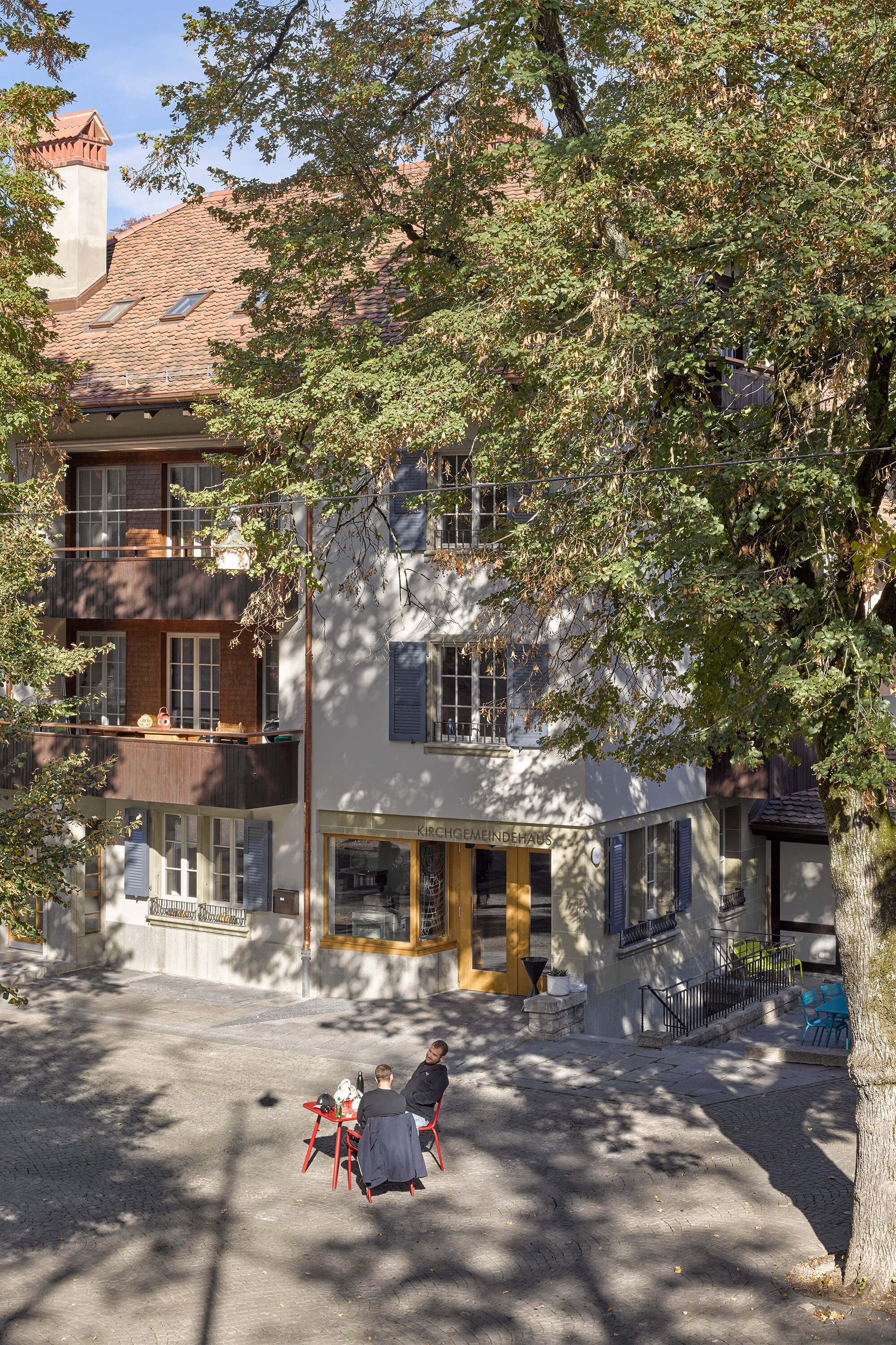 Dabei wurden Räume neu angeordnet, ein Treppenhaus entfernt, Betondecken gefräst, der Lift vergrössert, alle Hausinstallationen ersetzt, der Kirchgemeindesaal vergrössert, eine neue Industrieküche eingebaut, die Dachgeschosse ausgebaut und das Dach gedämmt und neu eingedeckt. Für die Farbgebung in den Wohnungen dienten die Farbstimmungen der 50er Jahre als Referenz, im Kirchgemeindehaus wurden Farben dezenter eingesetzt.
