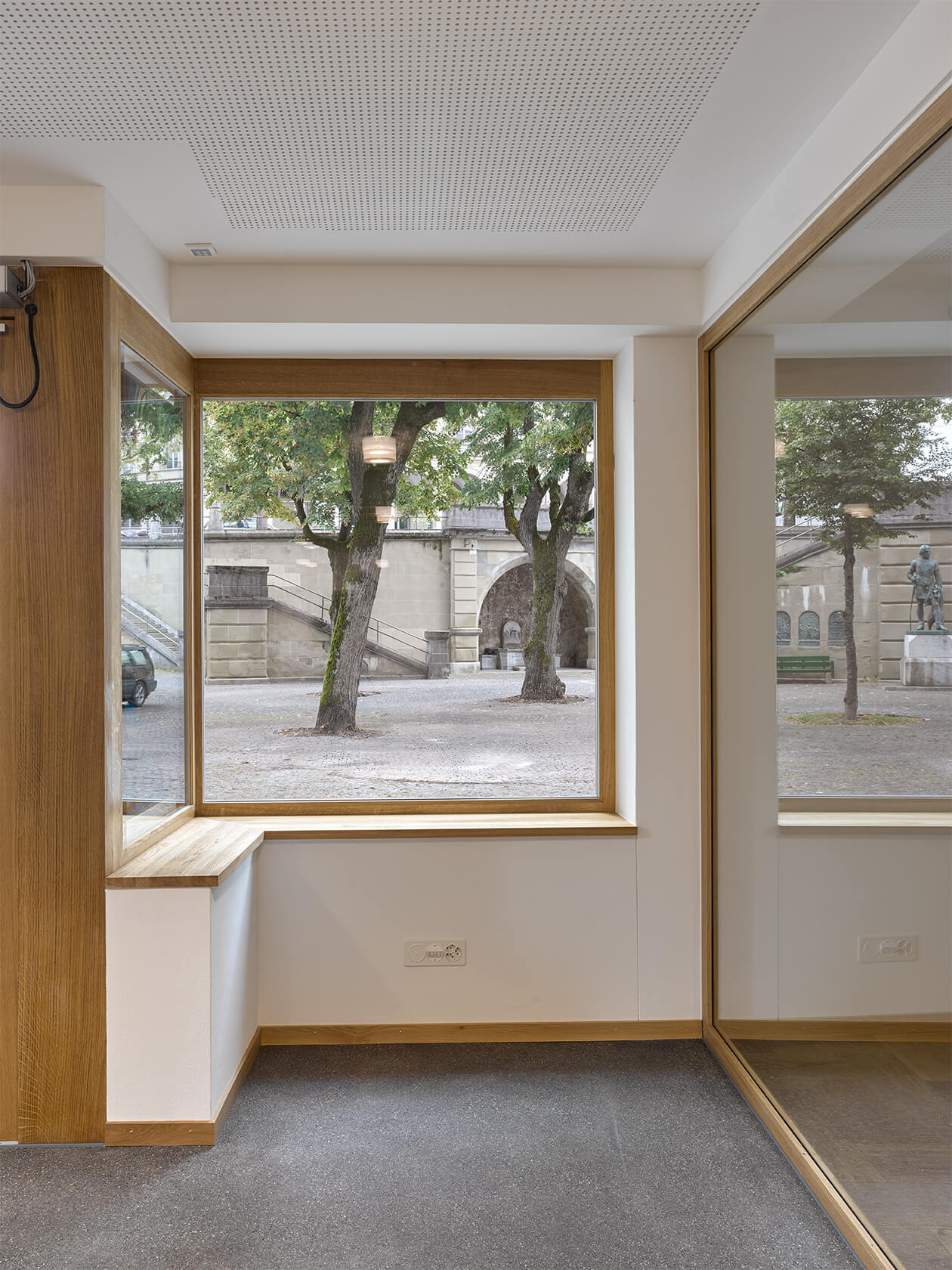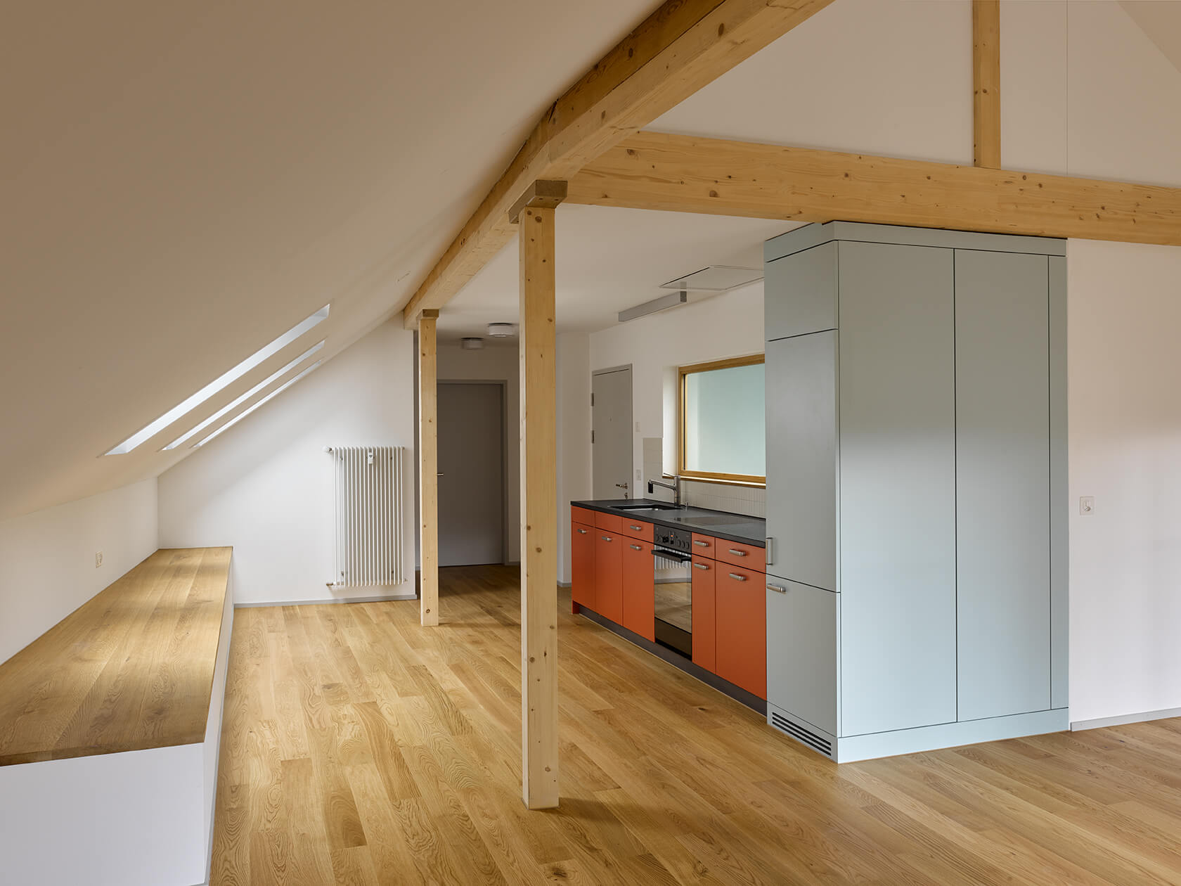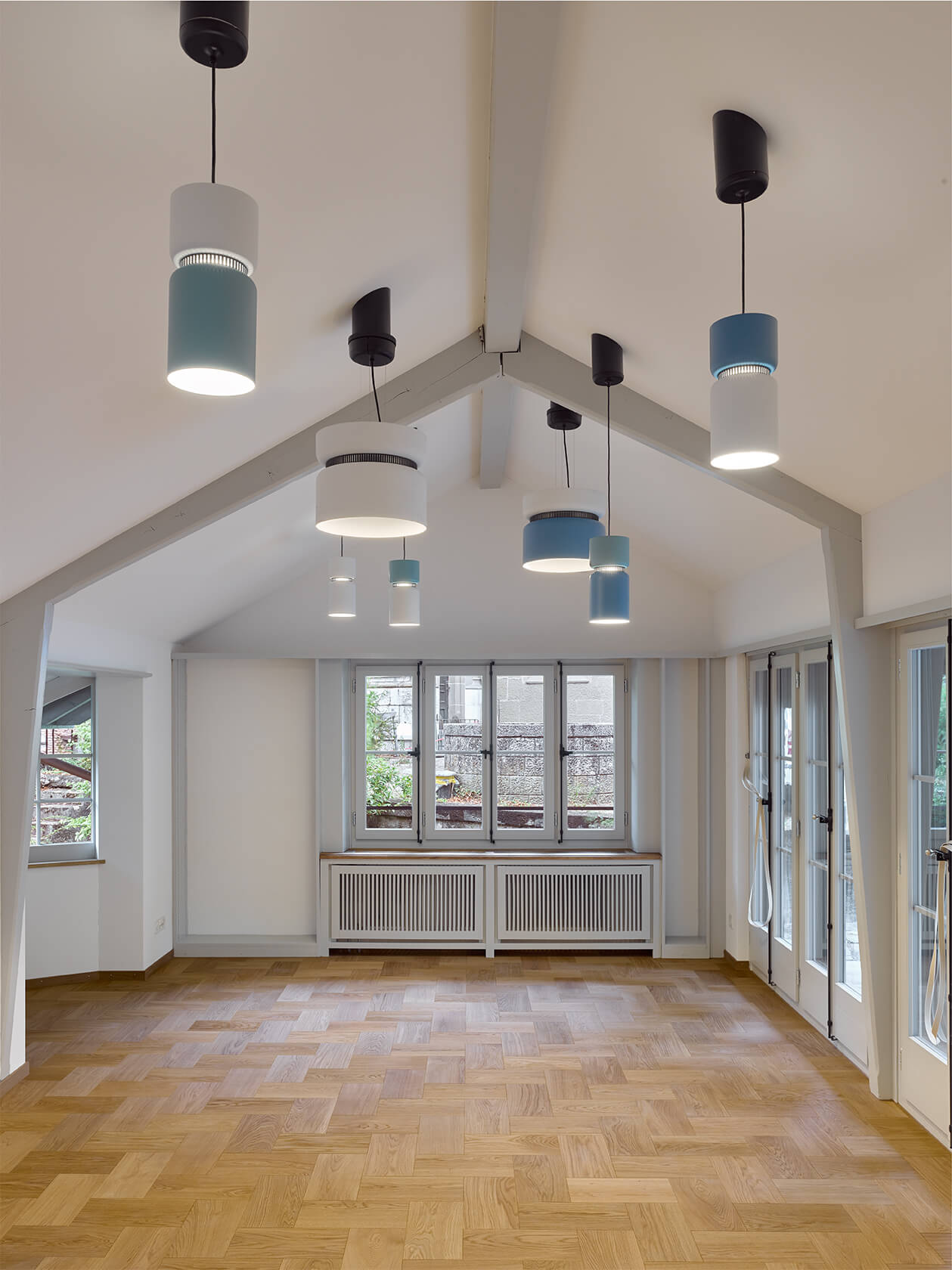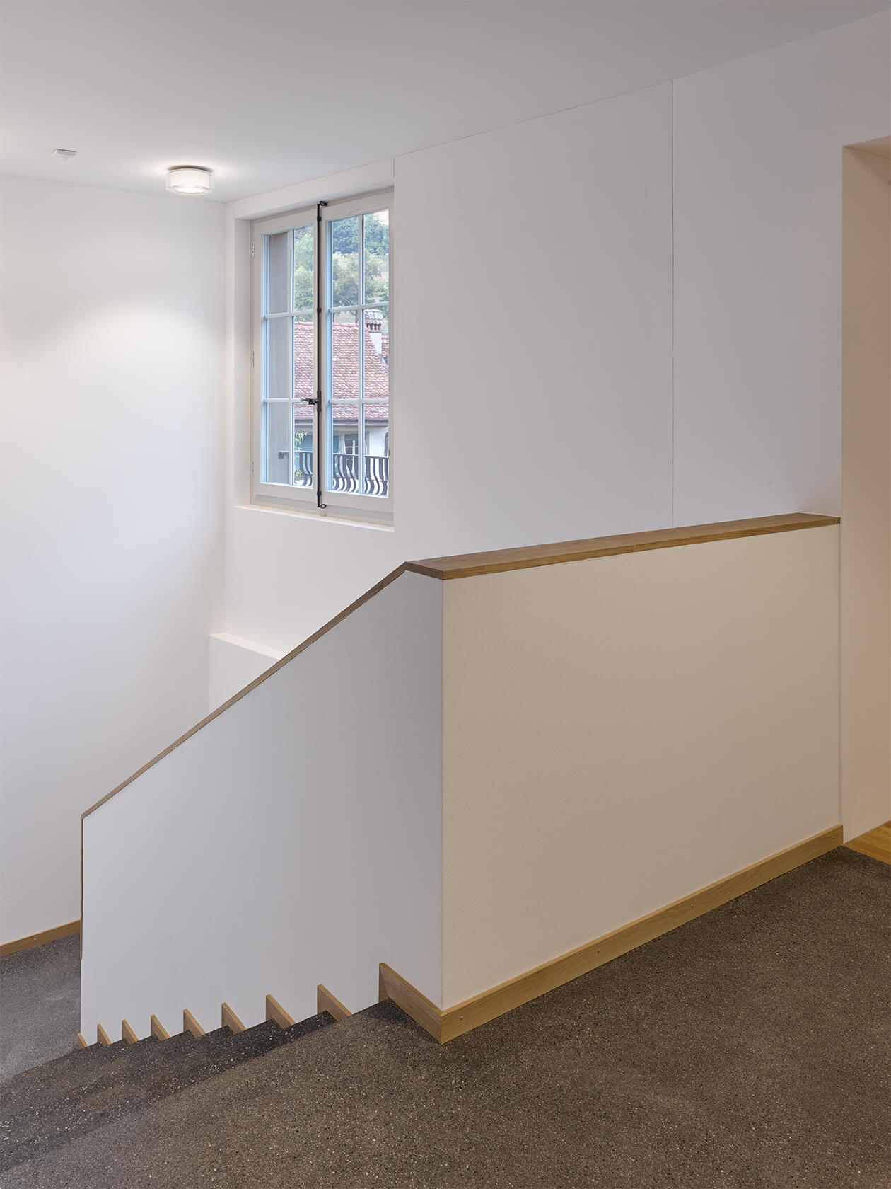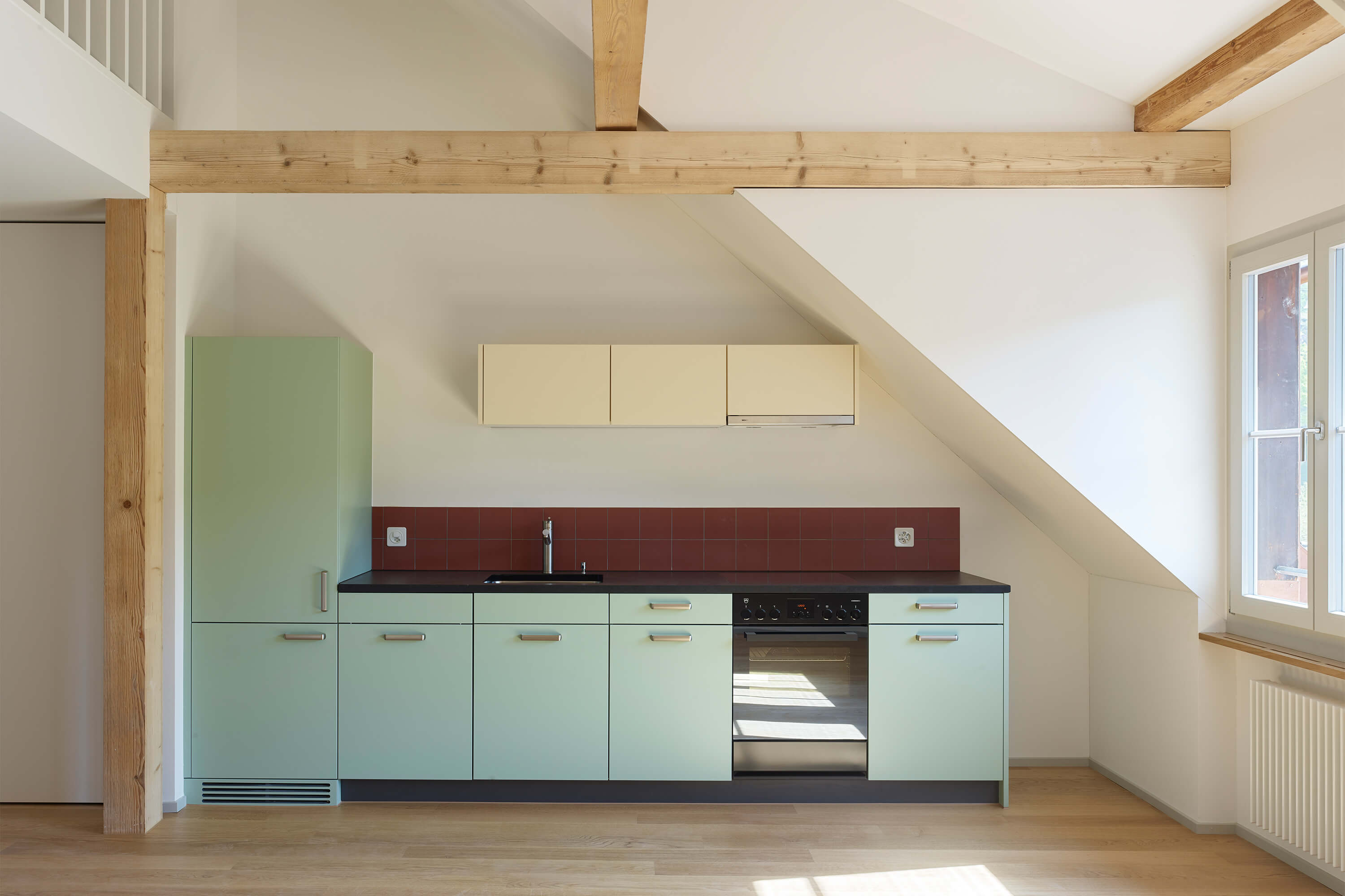 Dabei wurden Räume neu angeordnet, ein Treppenhaus entfernt, Betondecken gefräst, der Lift vergrössert, alle Hausinstallationen ersetzt, der Kirchgemeindesaal vergrössert, eine neue Industrieküche eingebaut, die Dachgeschosse ausgebaut und das Dach gedämmt und neu eingedeckt. Für die Farbgebung in den Wohnungen dienten die Farbstimmungen der 50er Jahre als Referenz, im Kirchgemeindehaus wurden Farben dezenter eingesetzt.