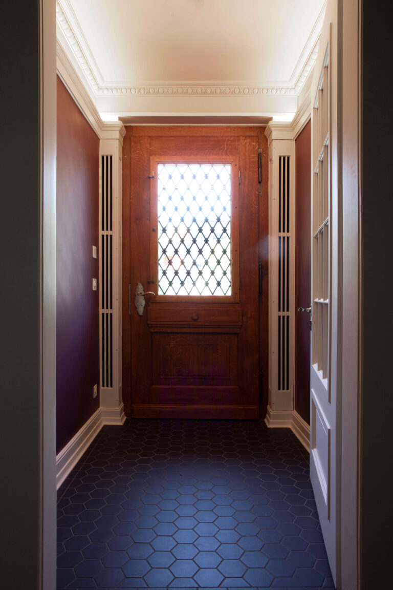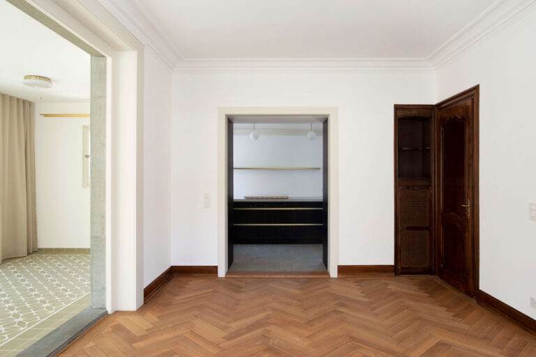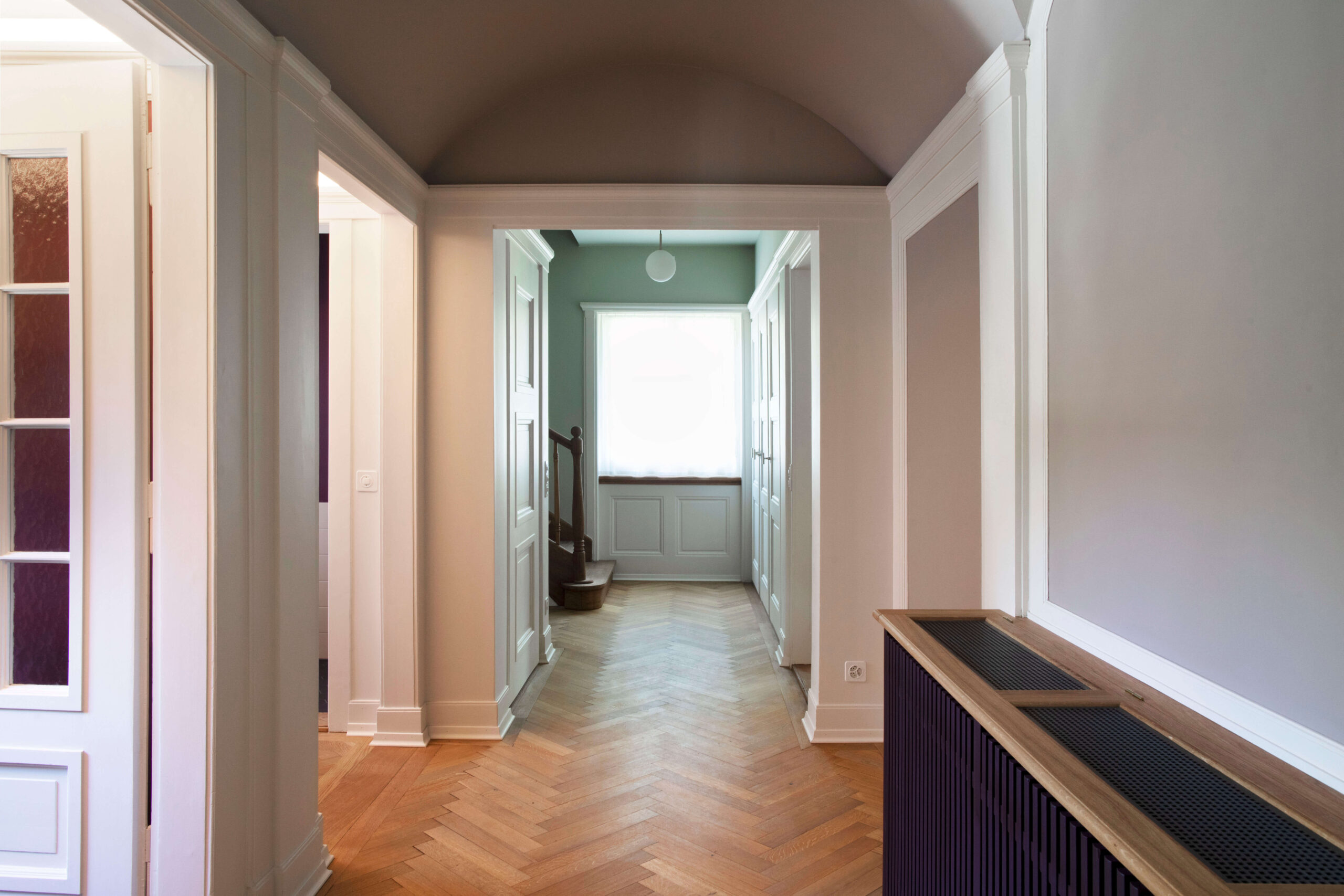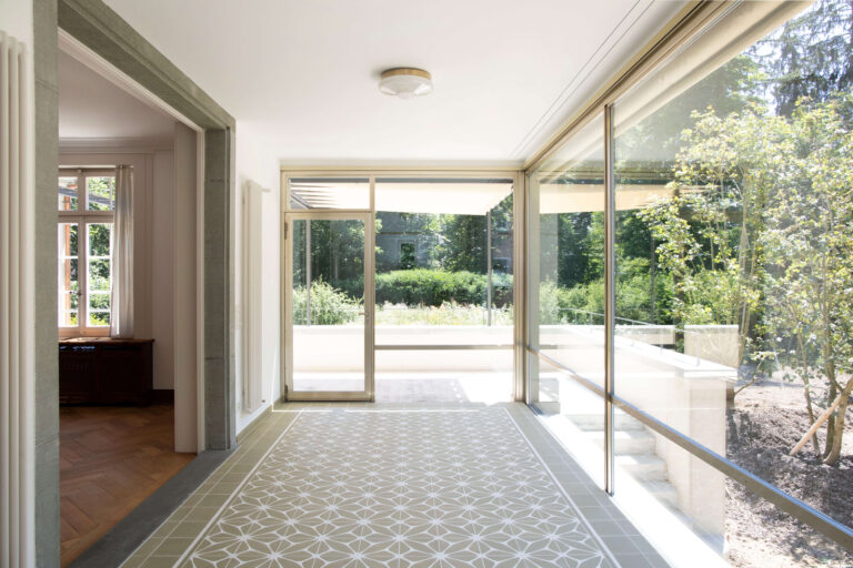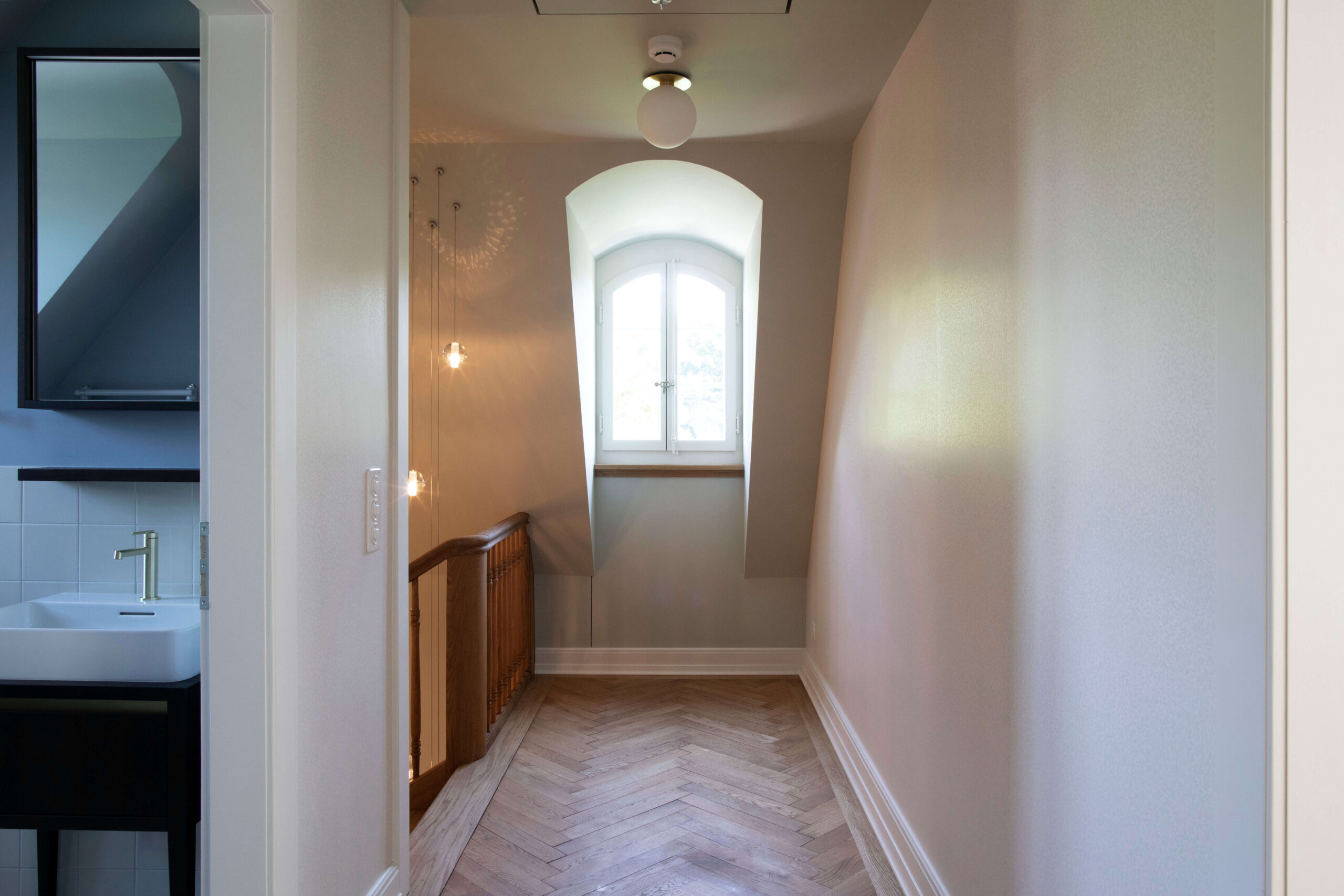 Ziel der respektvollen Sanierung der Villa war die Umnutzung der Liegenschaft für zeitgemässes, gehobenes Alterswohnen. Im Erdgeschoss befinden sich der Wohnbereich mit Küche, das Esszimmer und die Bibliothek sowie die Veranda. Das dortige historische Hebe-Schiebefenster, dessen Bedienung motorisiert wurde, verschwindet bei geöffnetem Zustand ins UG. Der Gartenzugang führt über die an die Veranda anschliessende Terrasse, welche mit einer neuen Pergola ergänzt wurde. Die Liegenschaft hat insgesamt fünf grosszügige Schlafzimmer mit je einem dazugehörigen Bad. Drei davon liegen im Obergeschoss und zwei im Dachgeschoss. Ein Teil des Untergeschosses wurde zu einem Aufenthaltsraum mit Kitchenette ausgebaut. Die Innenraumsanierung und die gehobene Ausstattung wurde mit hochwertigen Materialien ausgeführt: Aufwändige Schreinerarbeiten, ornamentale Tapeten und die sorgfältig sanierten Parkettböden verbinden die Raumabfolgen zu einem stimmigen Ganzen. Im ganzen Haus wurde ein an die historische Farbigkeit angelehntes Farbkonzept umgesetzt. Naturpigmente reflektieren das Licht an der Oberfläche und erzeugen eine tiefe, haptische Farboberfläche. Die Fassade wurde neu verputz und gestrichen. Das Dach ist mit aufwändigen, sorgfältig detaillierten Spenglerarbeiten eingekleidet. In Zusammenarbeit mit der Denkmalpflege wurden vier neue Lukarnen eingebaut.