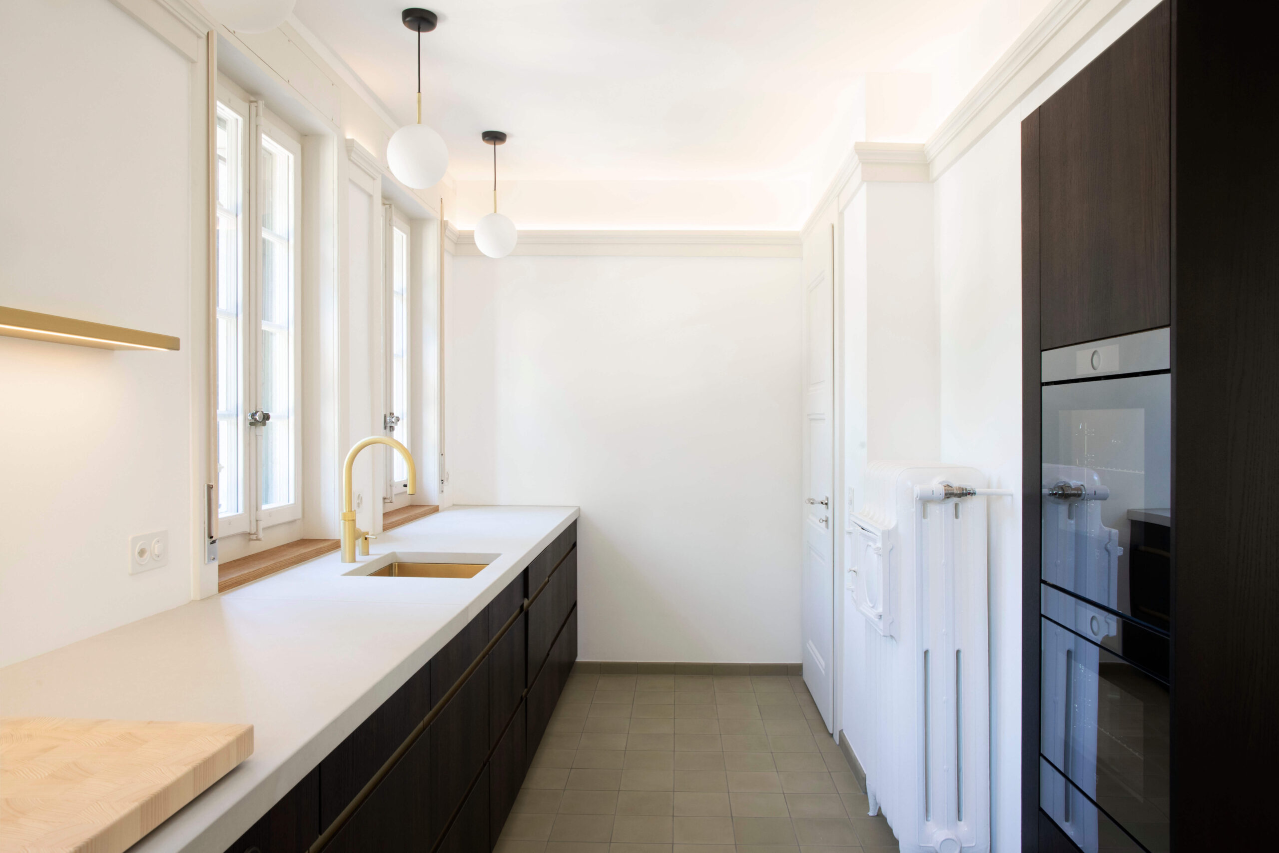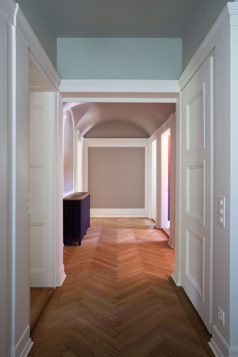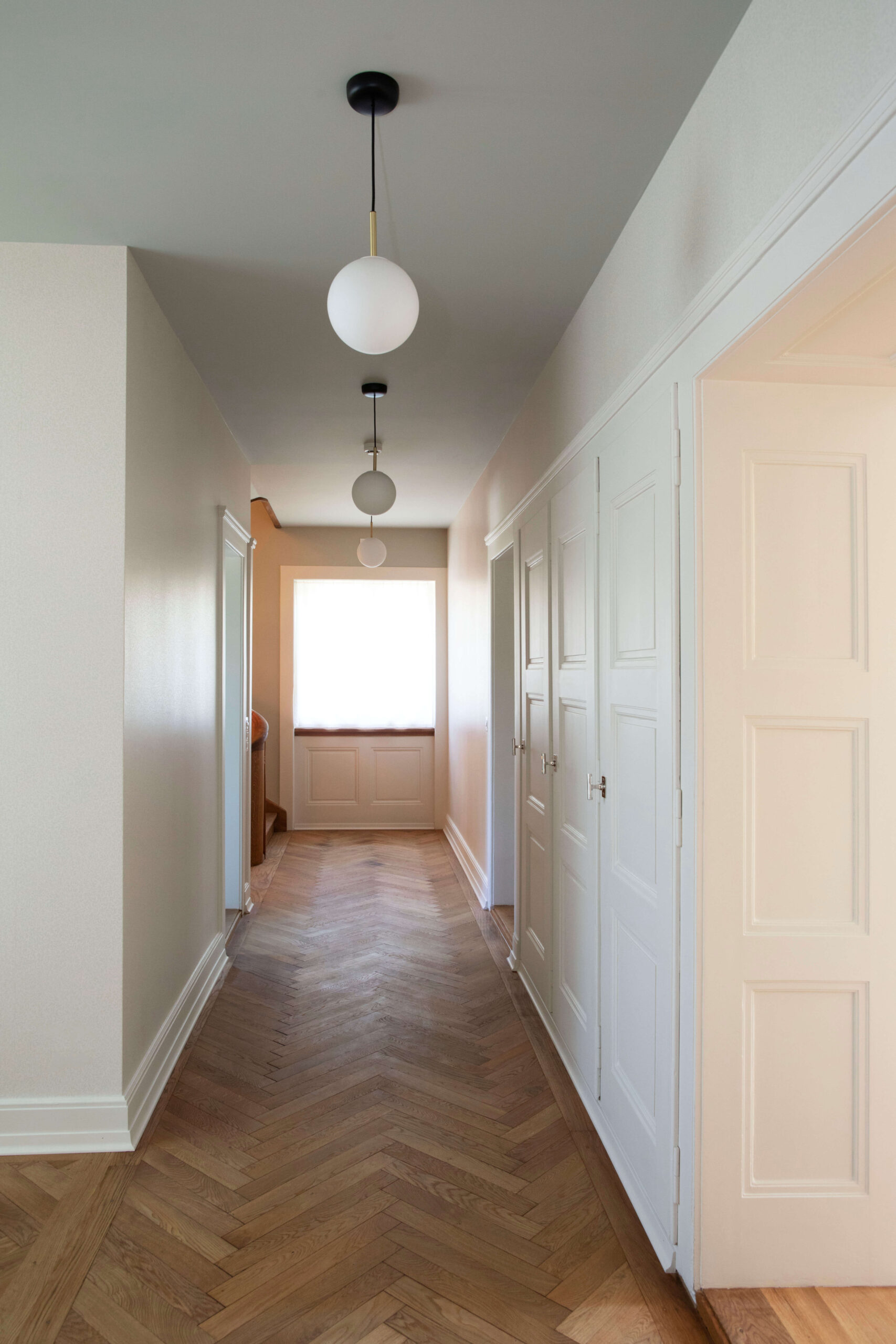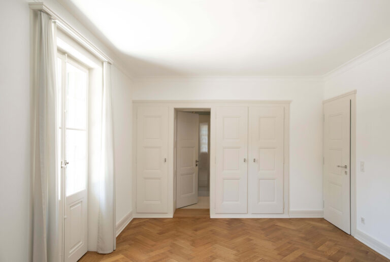 Ziel der respektvollen Sanierung der Villa war die Umnutzung der Liegenschaft für zeitgemässes, gehobenes Alterswohnen. Im Erdgeschoss befinden sich der Wohnbereich mit Küche, das Esszimmer und die Bibliothek sowie die Veranda. Das dortige historische Hebe-Schiebefenster, dessen Bedienung motorisiert wurde, verschwindet bei geöffnetem Zustand ins UG. Der Gartenzugang führt über die an die Veranda anschliessende Terrasse, welche mit einer neuen Pergola ergänzt wurde. Die Liegenschaft hat insgesamt fünf grosszügige Schlafzimmer mit je einem dazugehörigen Bad. Drei davon liegen im Obergeschoss und zwei im Dachgeschoss. Ein Teil des Untergeschosses wurde zu einem Aufenthaltsraum mit Kitchenette ausgebaut. Die Innenraumsanierung und die gehobene Ausstattung wurde mit hochwertigen Materialien ausgeführt: Aufwändige Schreinerarbeiten, ornamentale Tapeten und die sorgfältig sanierten Parkettböden verbinden die Raumabfolgen zu einem stimmigen Ganzen. Im ganzen Haus wurde ein an die historische Farbigkeit angelehntes Farbkonzept umgesetzt. Naturpigmente reflektieren das Licht an der Oberfläche und erzeugen eine tiefe, haptische Farboberfläche. Die Fassade wurde neu verputz und gestrichen. Das Dach ist mit aufwändigen, sorgfältig detaillierten Spenglerarbeiten eingekleidet. In Zusammenarbeit mit der Denkmalpflege wurden vier neue Lukarnen eingebaut.