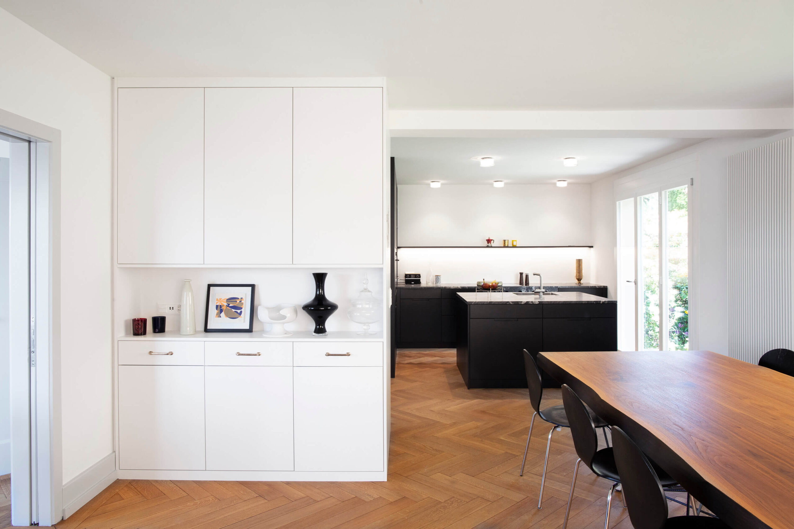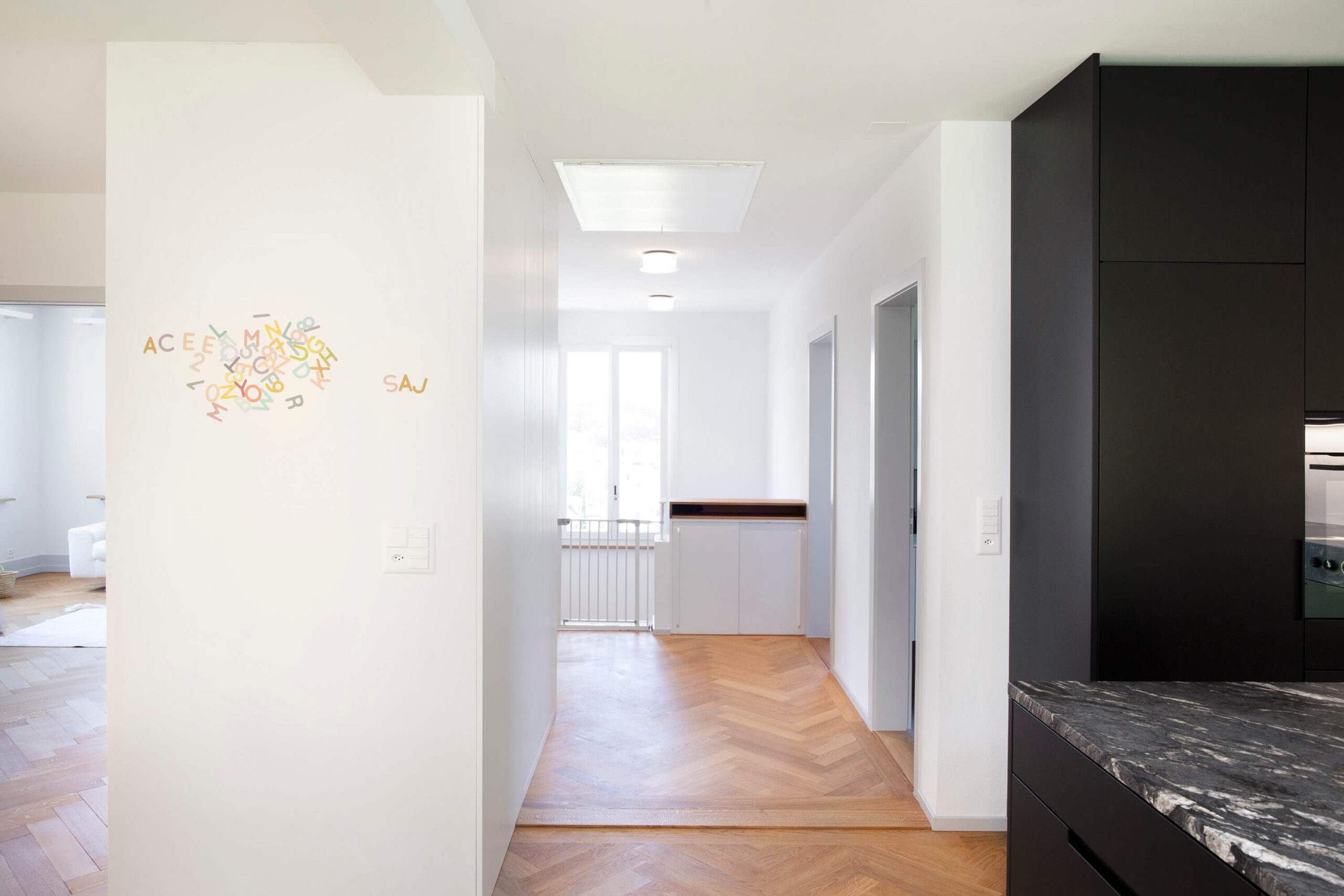 Das Einfamilienhaus am Hangweg weist, bedingt durch die extreme Hanglage, eine untypische Geschossgliederung auf: das Gebäude wird strassenseitig im Kellergeschoss erschlossen. Im 1. Obergeschoss befinden sich die Schlafräume und zwei Nasszellen sowie hangseitig die Waschküche und die Heizung. Im 2. Obergeschoss, auf Niveau Garten, befinden sich das Wohn- und das Esszimmer, ein Gästezimmer, die Küche und eine weitere Nasszelle. Die Küche wurde zum Hang hin in das ehemalige Schlafzimmer verlegt und ein direkter Zugang zum Garten erstellt. Ein Mauerdurchbruch verbindet die Küche mit dem Esszimmer. Im ganzen Haus wurden die Oberflächen aufgefrischt und alle Nasszellen inkl. Ver- und Entsorgungsleitungen erneuert.