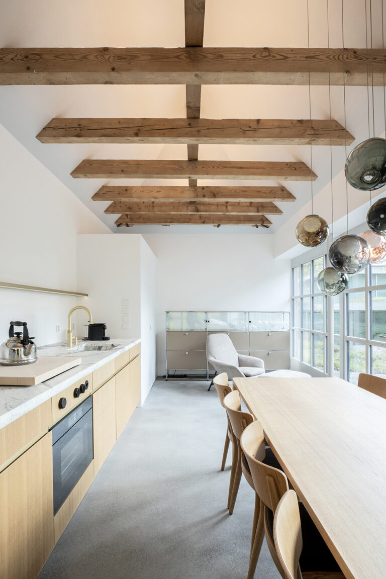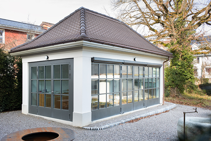 Ausbau einer alten Garage zu einem Garten Pavillon, in Zusammenarbeit mit der Denkmalpflege und Studio Laure Krayenbühl.