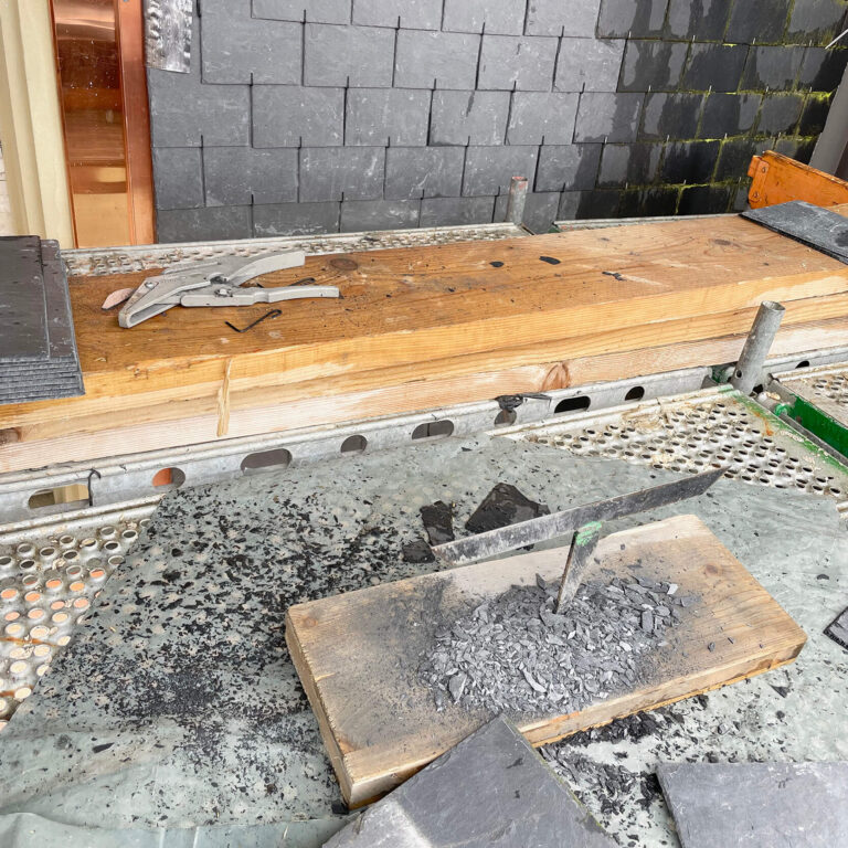 An der Militärstrasse wird das Mansardendach neu mit Naturschiefer eingedeckt.