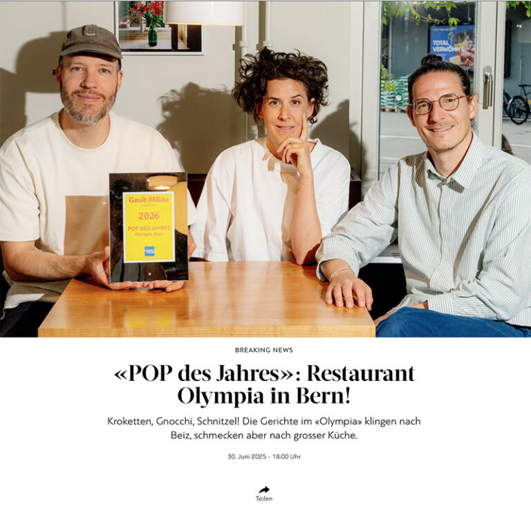 Wir gratulieren dem Team vom Olympia zur Gault&Millau-Auszeichnung POP des Jahres und freuen uns, dass die von uns entworfene lockere, stilvolle Atmosphäre des Lokals zum gesamten Gastroerlebnis beiträgt.